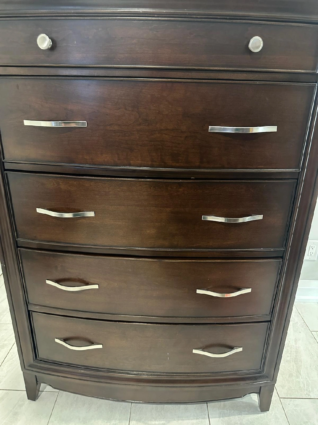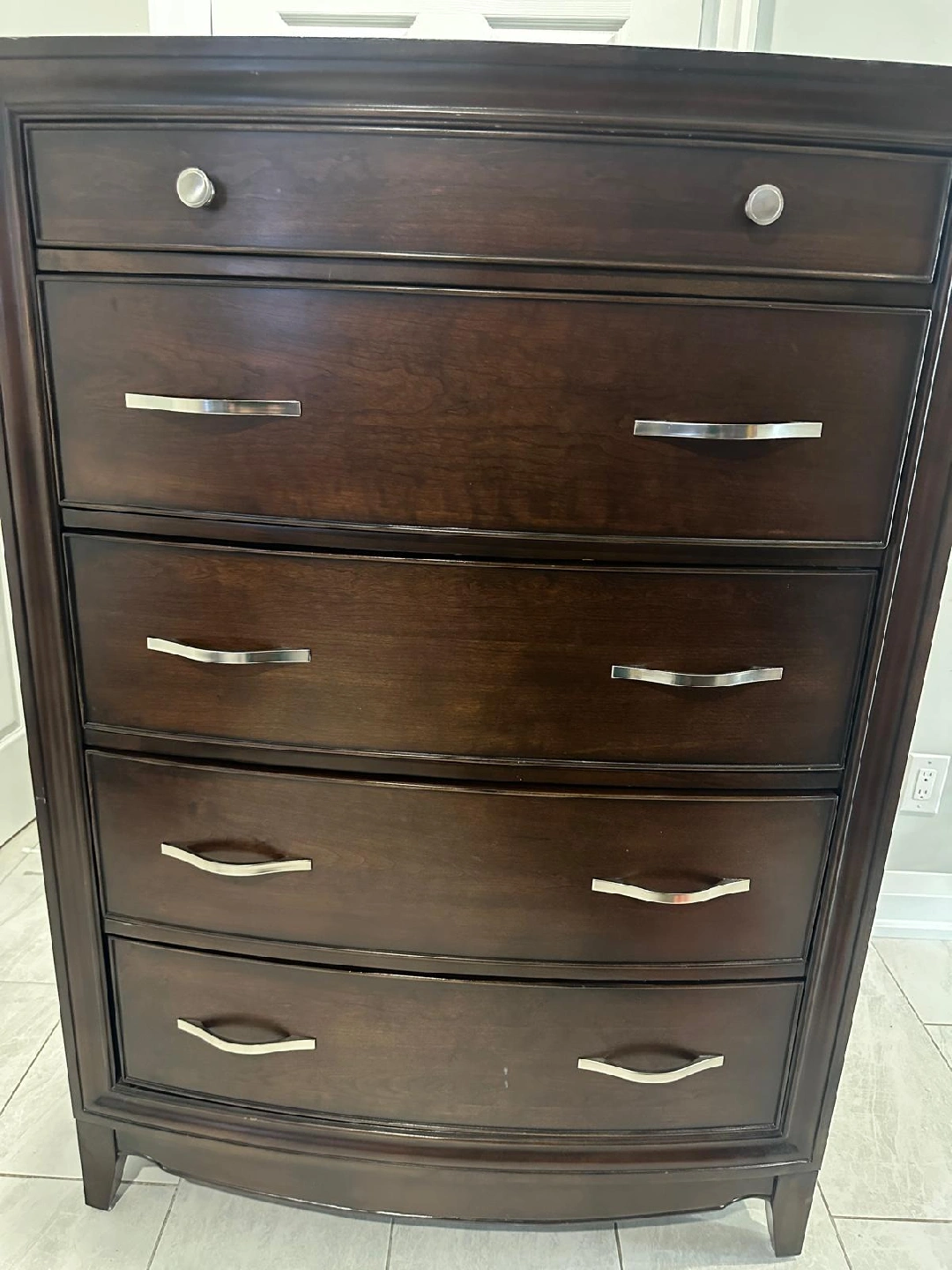 Selling a lovely dark wood chest of drawers! It features five spacious drawers with silver-tone handles. Perfect for adding some classic style to your bedroom or living space. It's in great shape and ready for a new home!