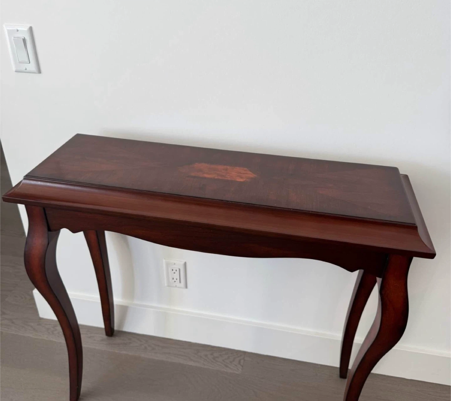 83Selling a lovely dark wood accent table. It has a beautiful wood grain design on top and elegantly curved legs. It's in great condition and would make a stylish addition to any room