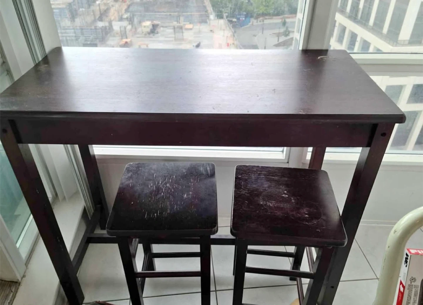 10Selling a dark wood breakfast table that comes with 4 matching stools. It's a great set for a smaller space or to add a little extra seating to your kitchen or dining area. The table and stools are in Good condition. Still lots of life left!