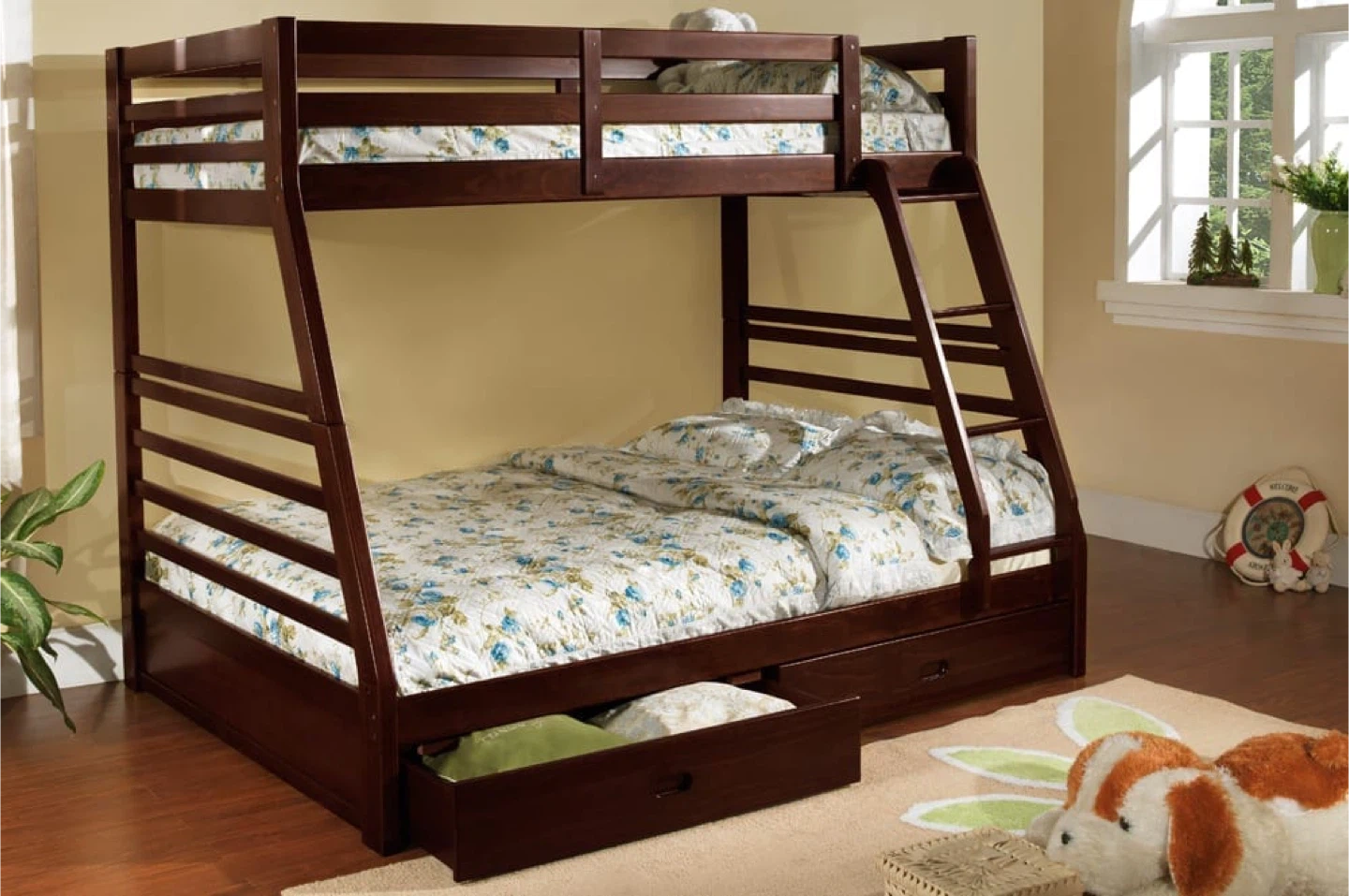 15Selling a dark wood bunk bed. It features a sturdy frame and includes a ladder for easy access to the top bunk. There are also storage drawers underneath for extra space! Perfect for a kids' room or a guest room