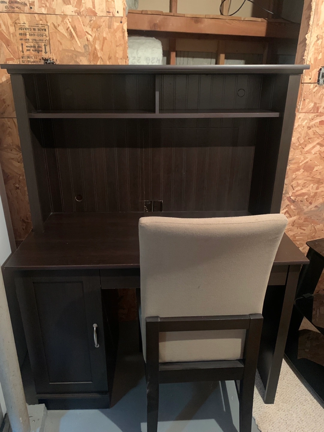 Selling a dark wood desk with a hutch and matching chair. It's a great set for a home office or student space. The desk has a cabinet and the hutch offers extra storage. The chair is upholstered and comfortable. Perfect for getting work done!