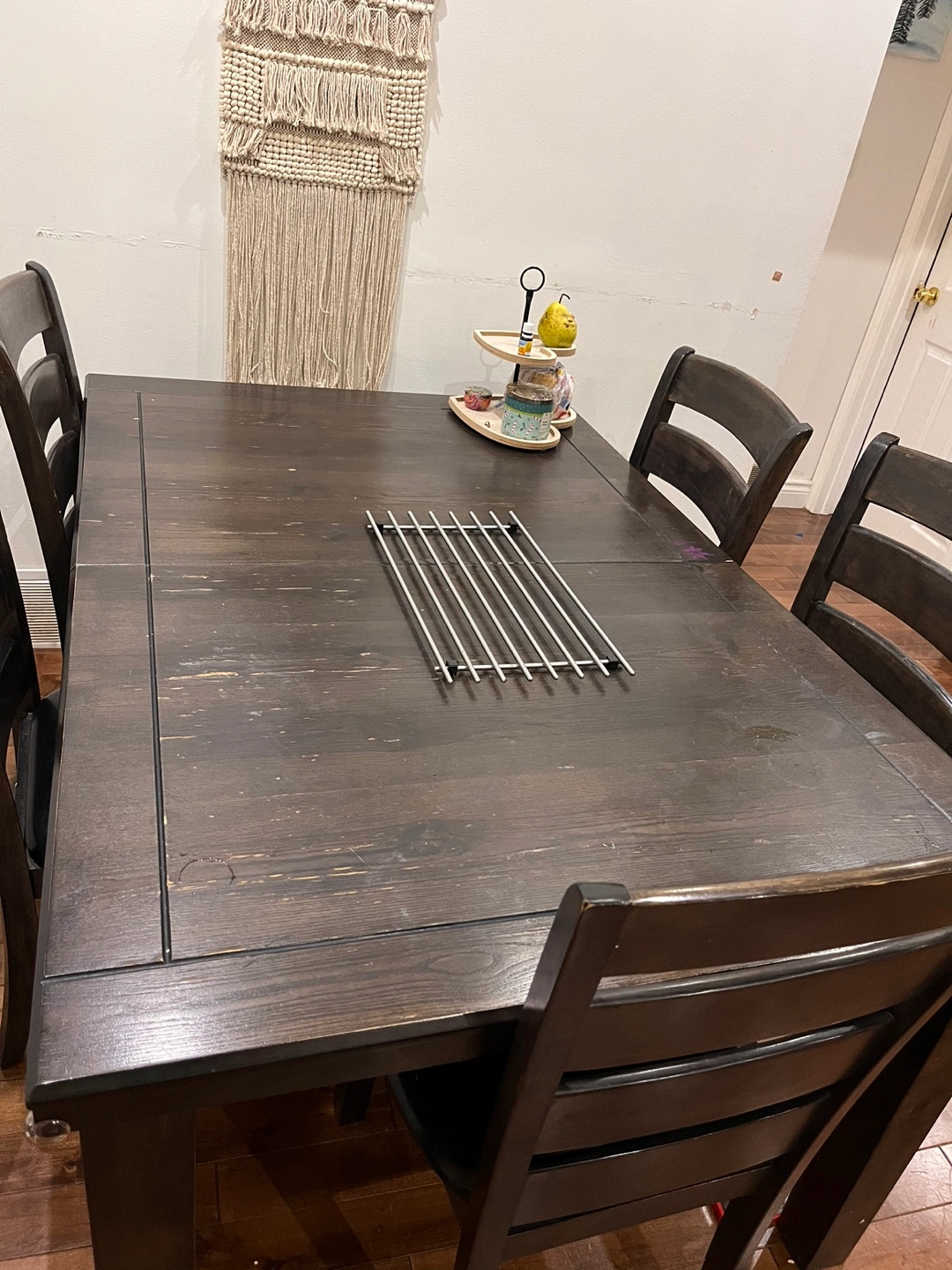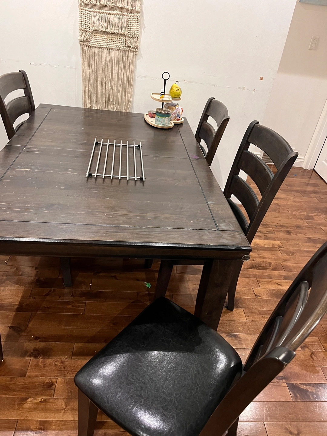 Selling a dark wood dining table that comes with five matching chairs! It's a sturdy set and has served us well. The table has a few minor signs of use, but overall it's in good condition and ready for a new home. Perfect for family dinners or game nights! I am sorry I deleted the app previously. Size: L 63” W 42” and it’s expandable to another roughly 20”