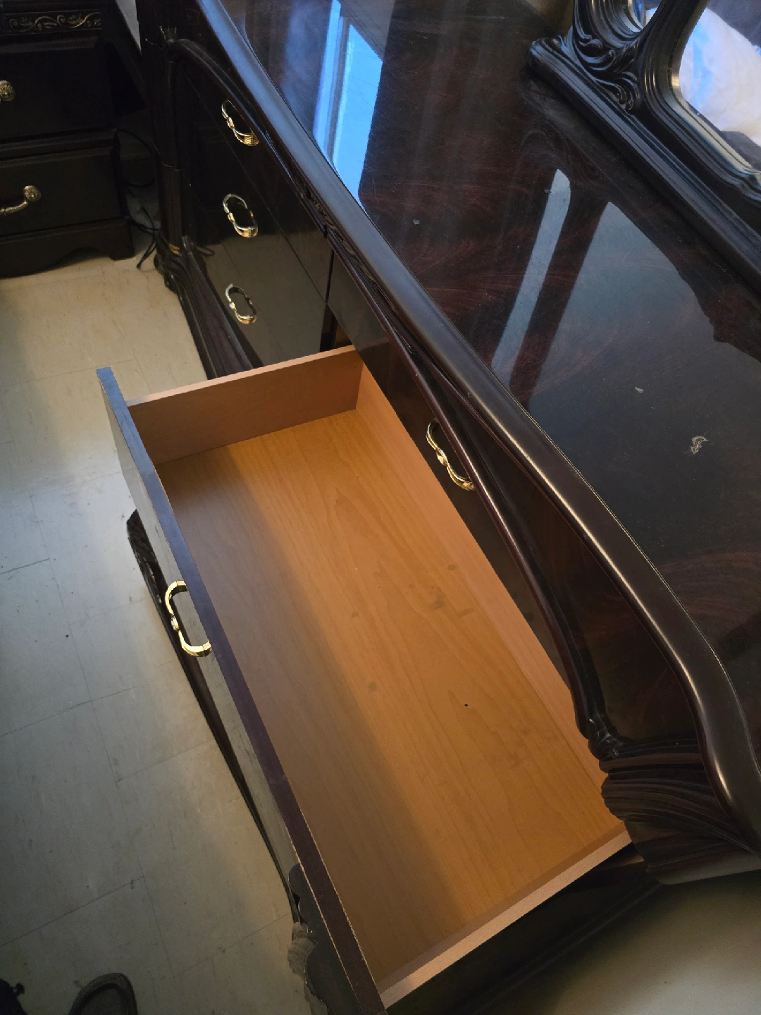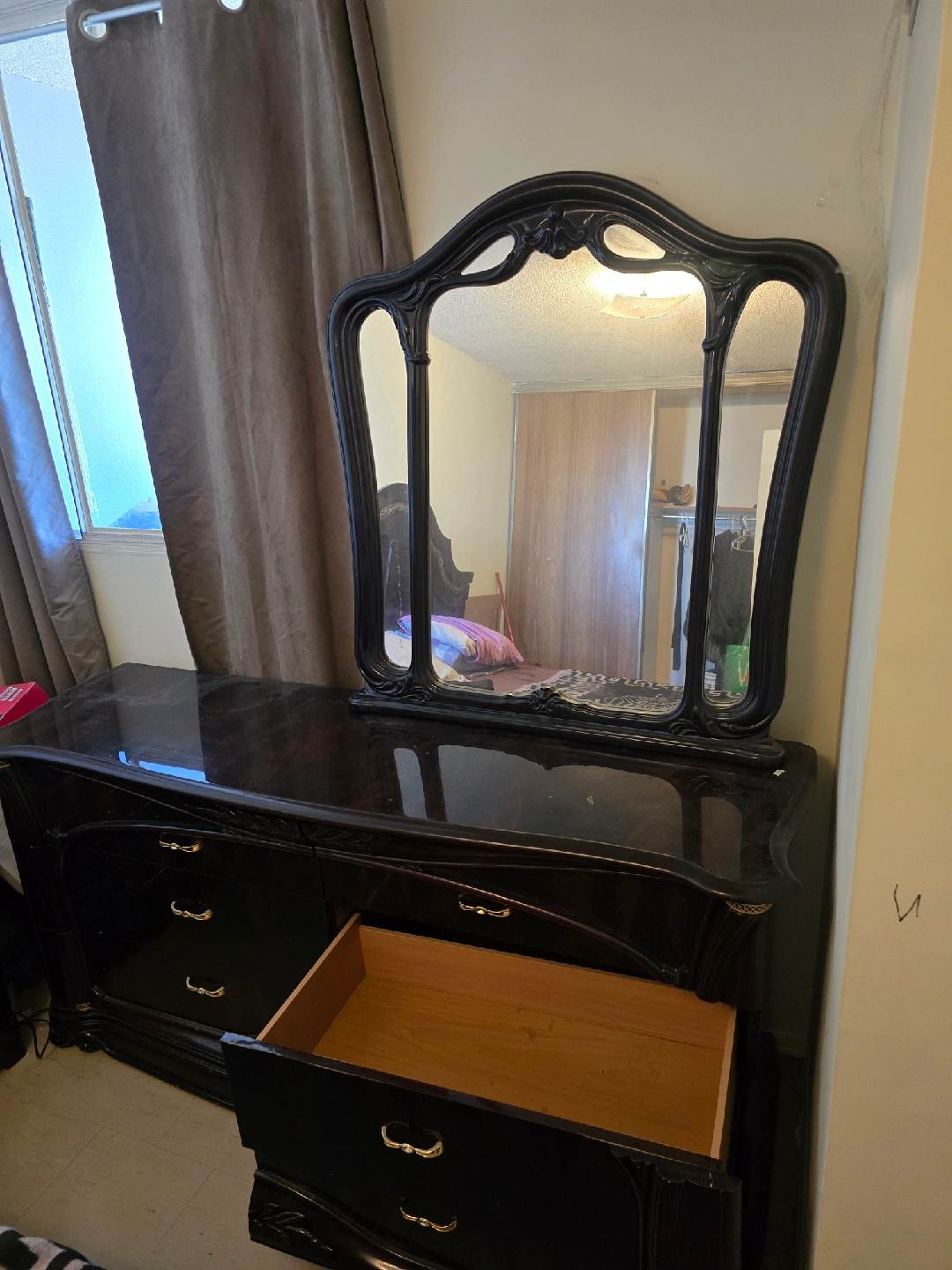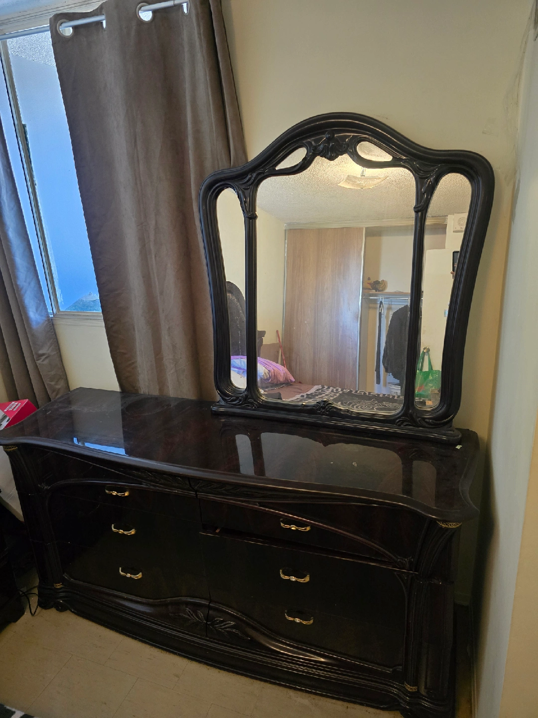 Selling a beautiful dark wood dresser with an attached mirror. It features ornate detailing and plenty of drawer space for storage. A great addition to any bedroom! 1 peace. cannot be disassembled. Obo.