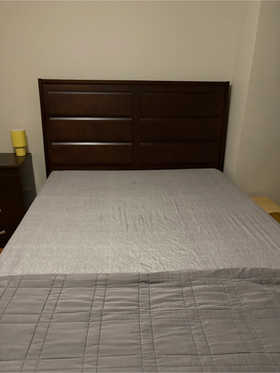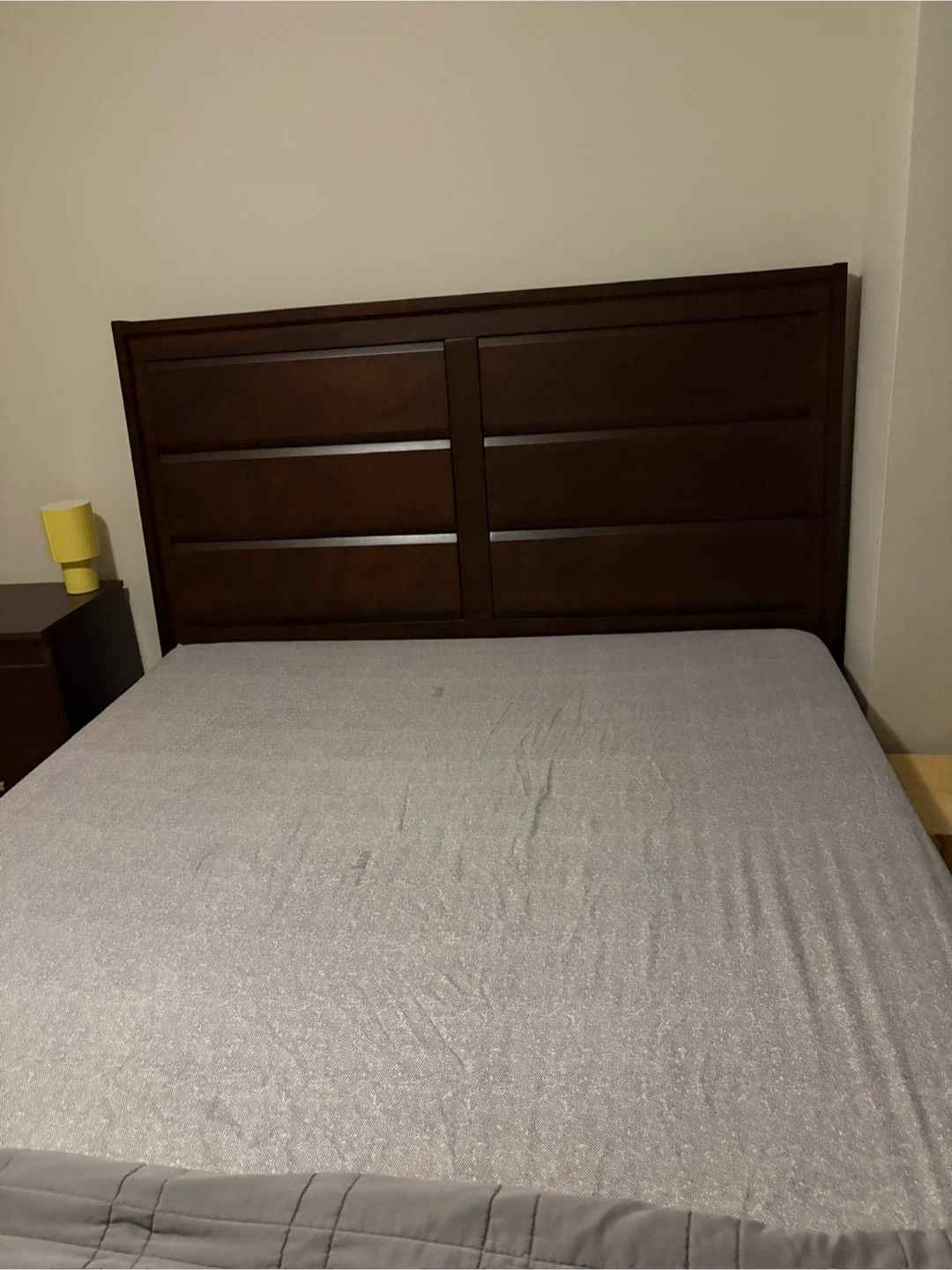 60Selling a queen size bed frame with a dark wood finish. It's in good condition and has a classic design that would fit well in many bedrooms. The headboard has a nice panelled design. The frame is sturdy and ready for a new home!