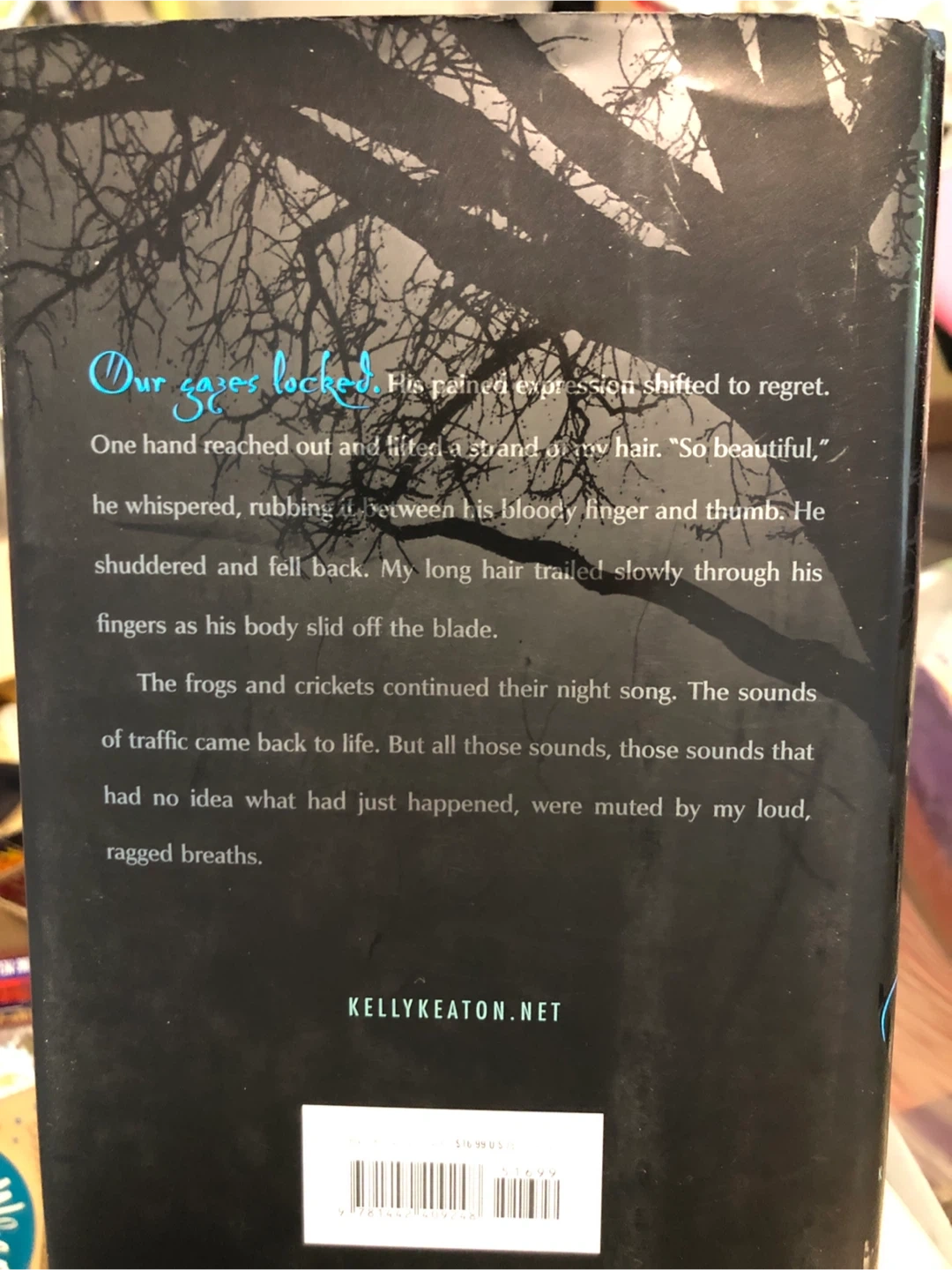 Got this book mega long time ago, never read it tho. Description reads: Our gazes locked. His pained expression shifted to regret. One hand reached out and lifted a strand of my hair. “So beautiful,” he whispered, rubbing it between his bloody finger and thumb. He shuddered and fell back. My long hair trailed slowly through his fingers as his body slid off the blade. The frogs and crickets continued their night song. The sounds of traffic came back to life. But all those sounds, those sounds that had no idea what had just happened, we’re muted by my loud, ragged breaths.
