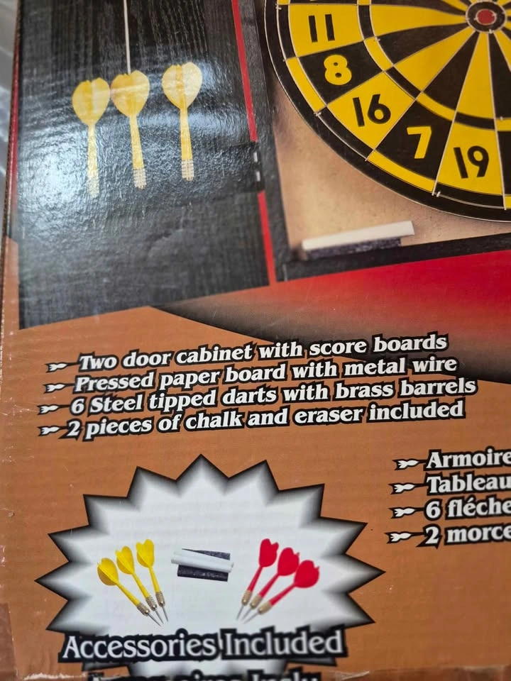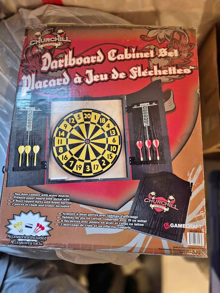 Get ready for some fun with this brand new Churchill Dartboard Cabinet Set, complete with a two-door cabinet featuring scoreboards, a pressed paper board with metal wire, six steel-tipped darts with brass barrels, and chalk with an eraser. This set is the perfect addition to your game room for endless entertainment! * Two-door cabinet with score boards * Pressed paper board with metal wire * 6 steel-tipped darts with brass barrels * 2 pieces of chalk and eraser included Looking to add some whimsy to your game nights? This dartboard set is the ticket! And remember, if the ad's still up, it's still up for grabs!