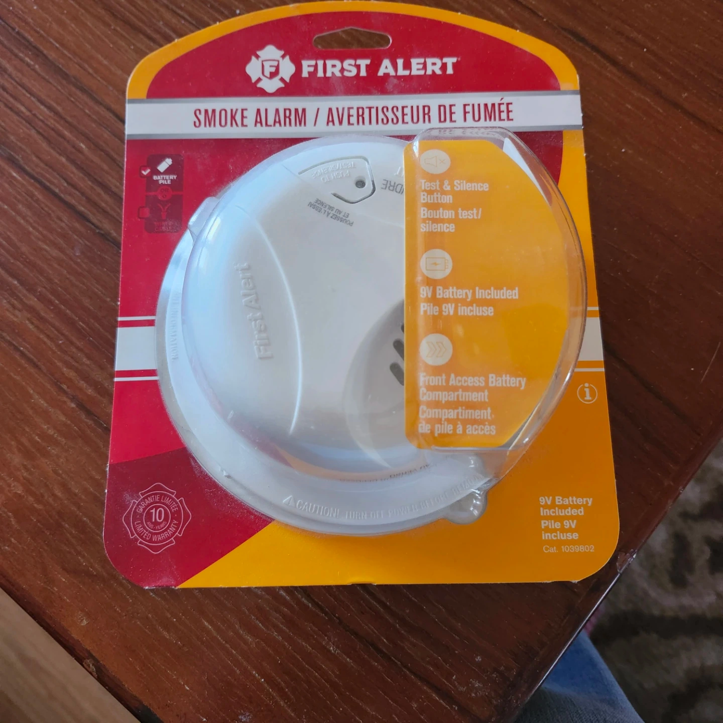 This is a new First Alert smoke alarm in its original packaging. It includes a 9V battery and features a test/silence button. The front access battery compartment makes it easy to change batteries. It's designed for home use and includes a 10-year limited warranty. I bought 1 too many and moving soon, buy new is $15.