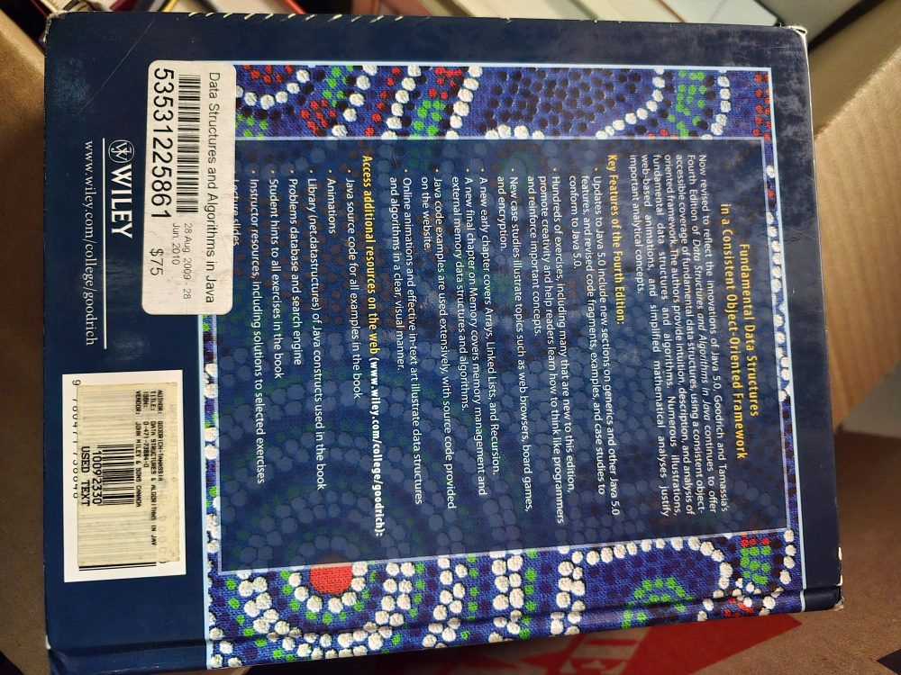 Used textbook, fourth edition. Covers data structures, algorithms, and Java 5.0. Includes solutions to selected exercises. Good condition.