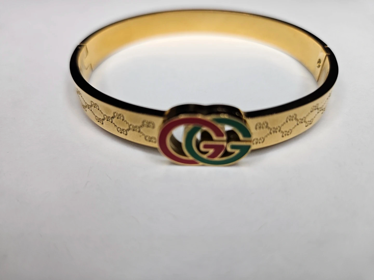 This stylish gold-tone bangle bracelet features the iconic Gucci GG logo with red and green enamel details. It has a secure clasp closure and a patterned band. It's a statement piece for any fashion-forward individual.
