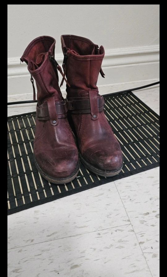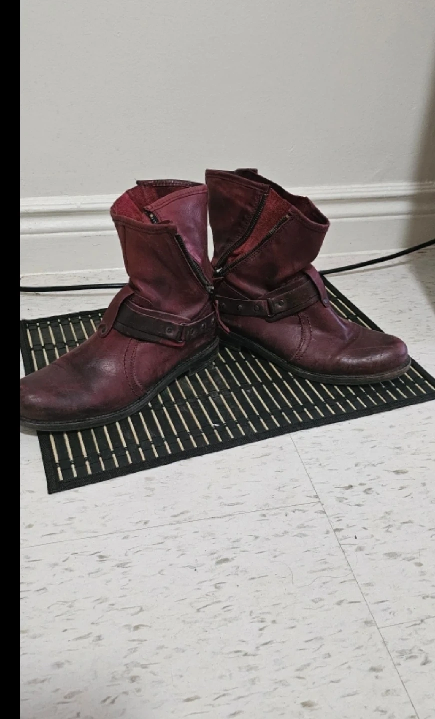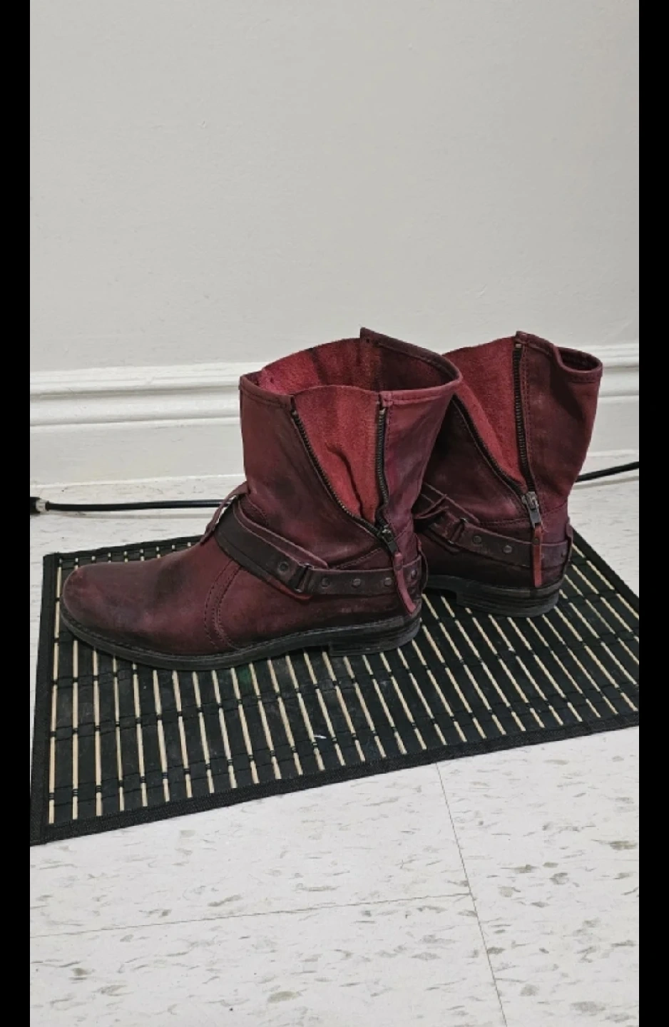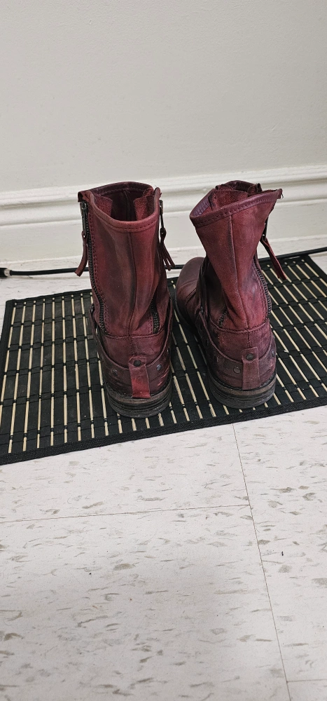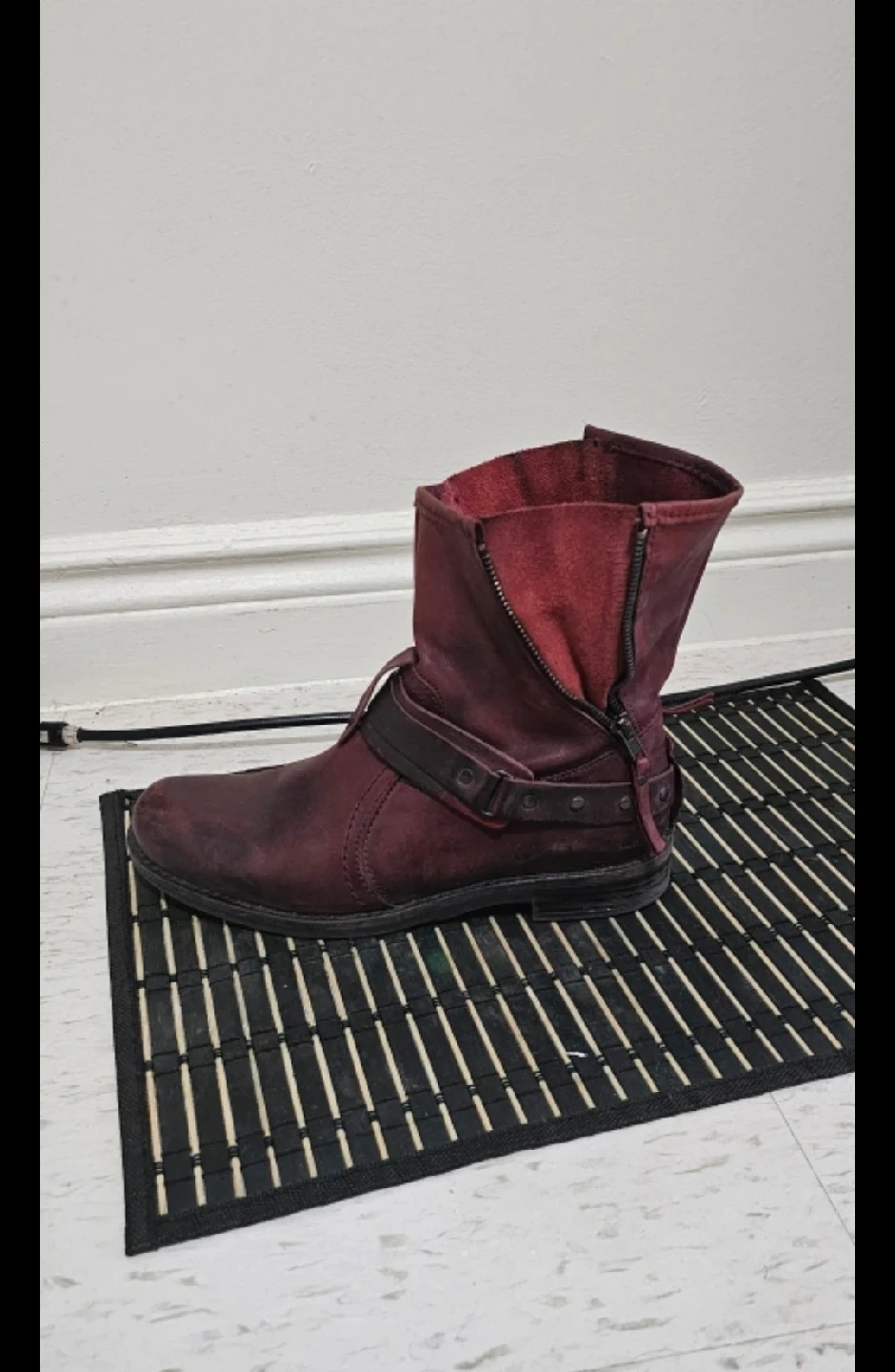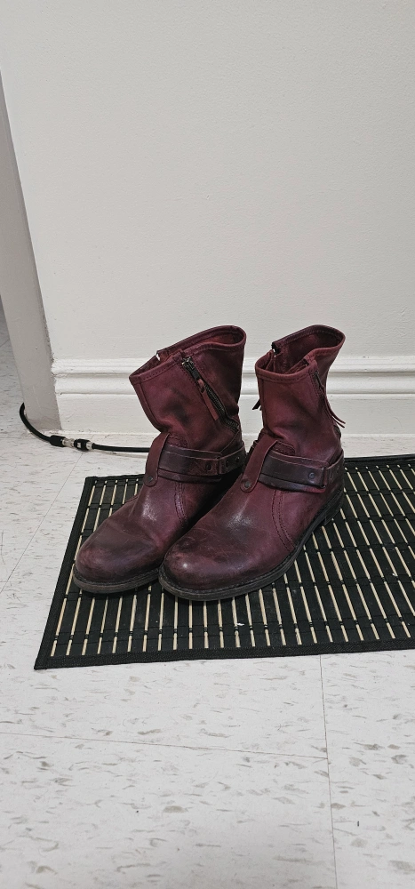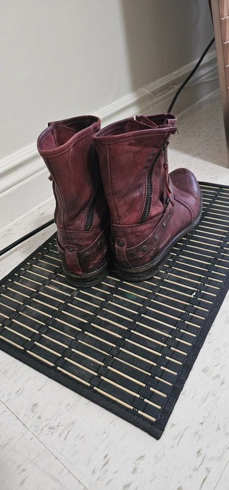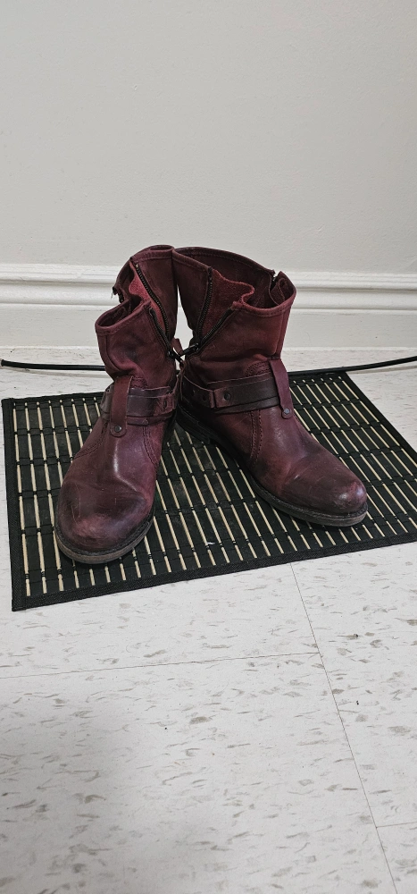 1000+These burgundy leather ankle boots have a unique, worn-in look! They feature 4 zipper closure and a decorative strap detail. Perfect for adding a bit of edge to your outfit!