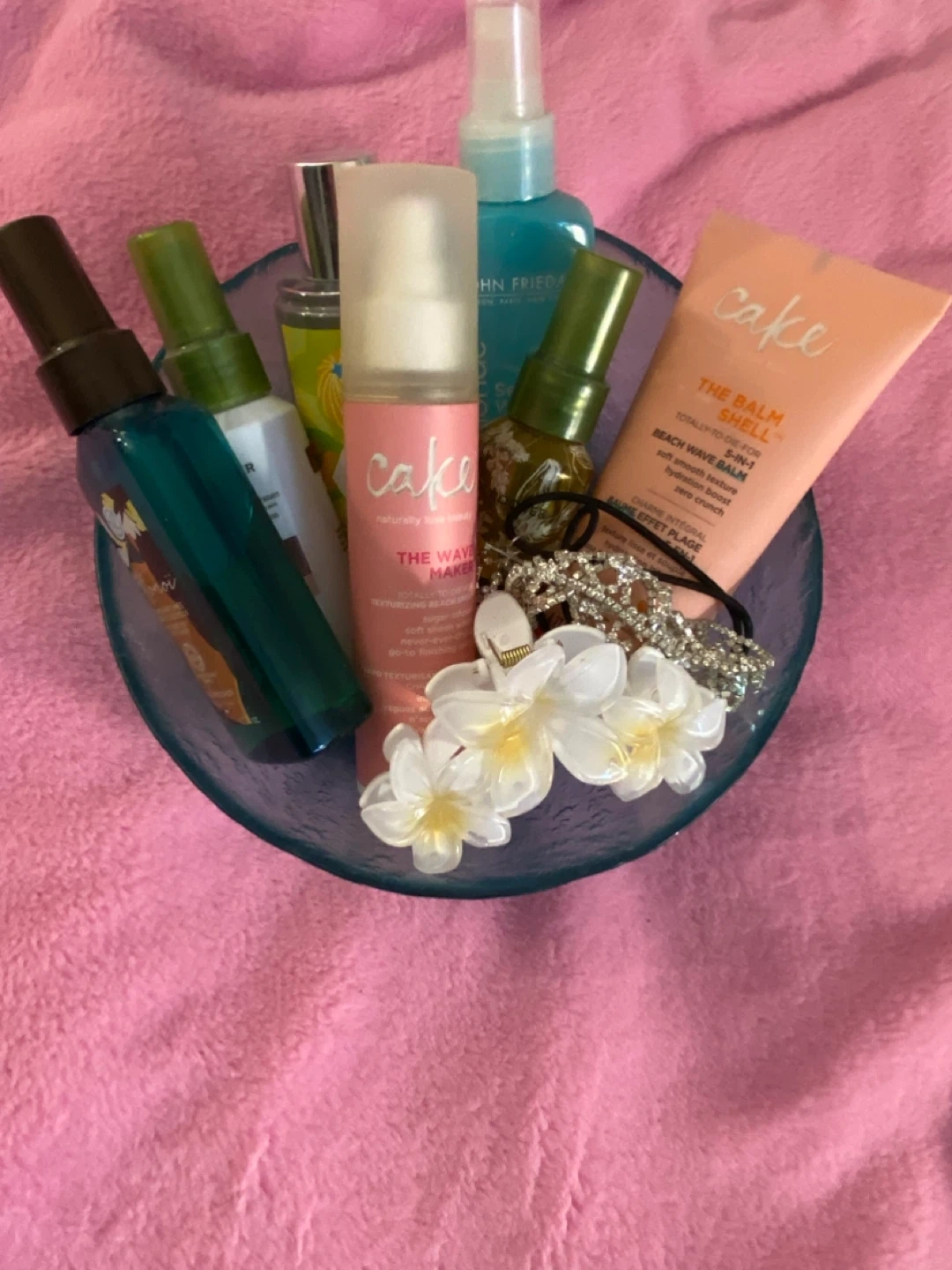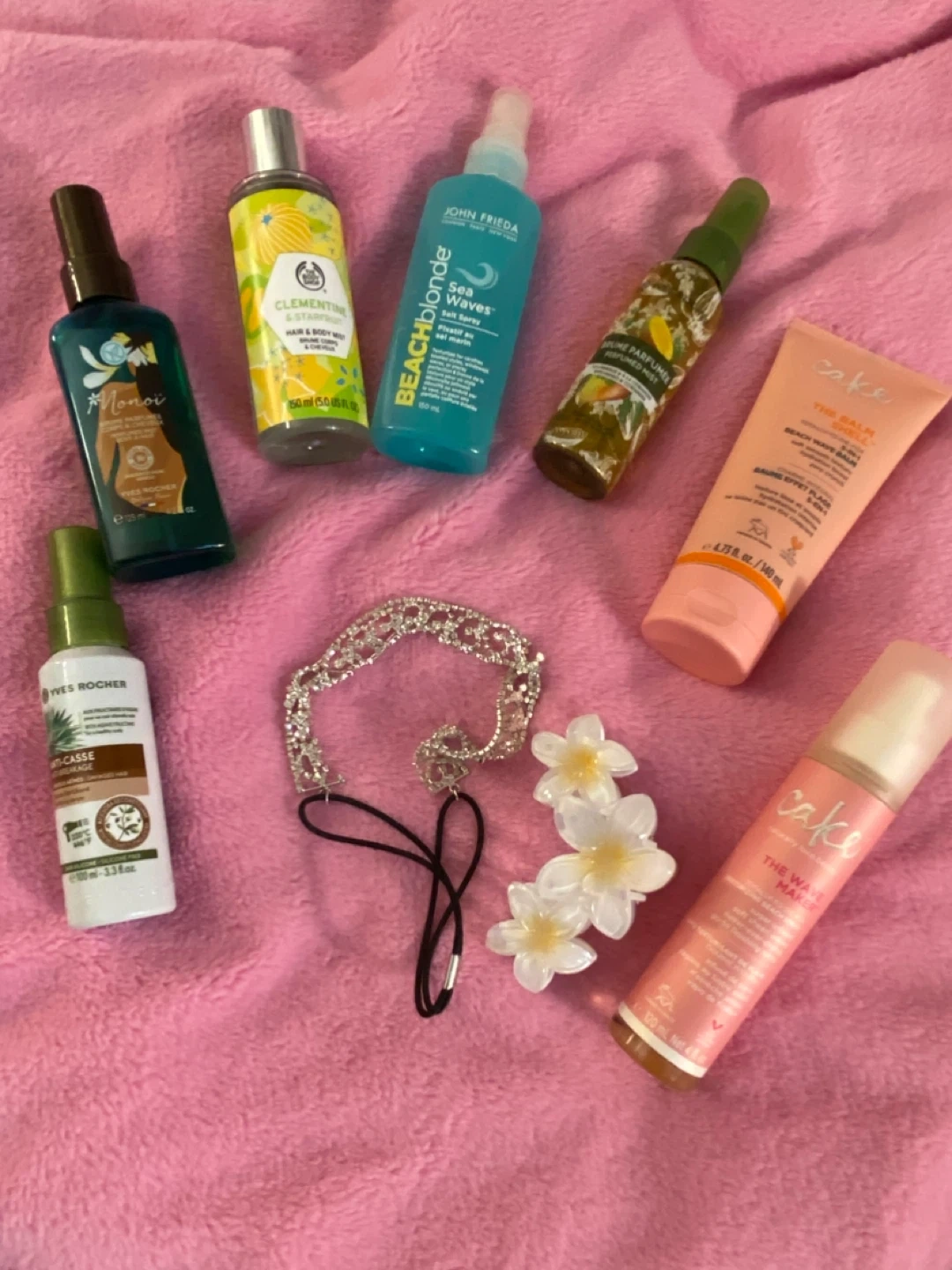 Also Yves rocher monoi perfumed hair mist, the body shop clementine hair mist, Yves rocher heat protectant crème, John Frieda Beach blonde sea waves mist, another saves rocher hsir mist in a mango scent, a sparkly hair band and a white floral hair clip all in a large bowl.