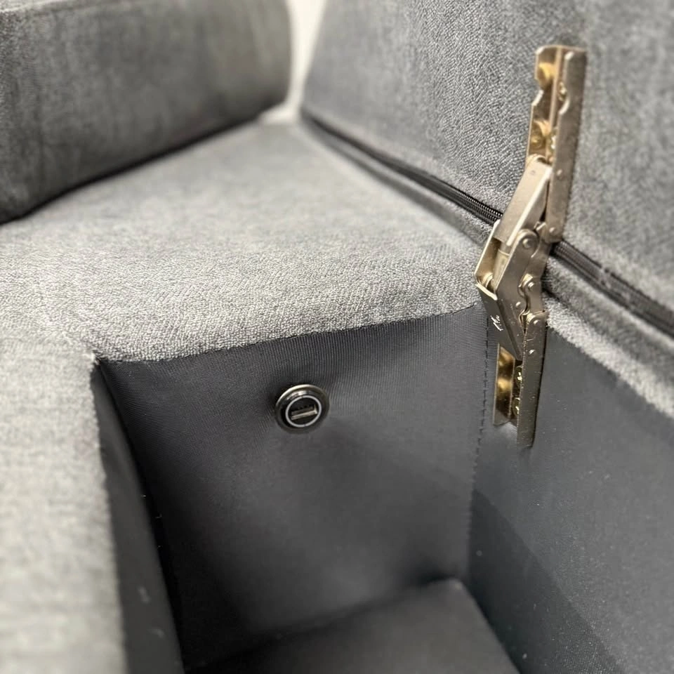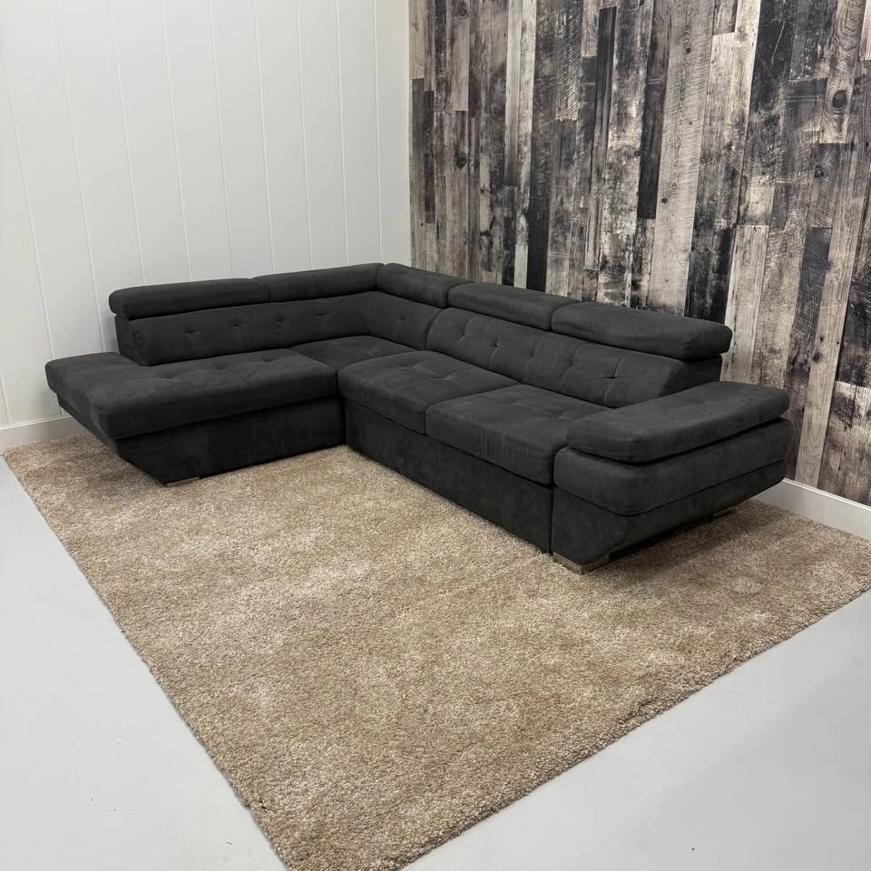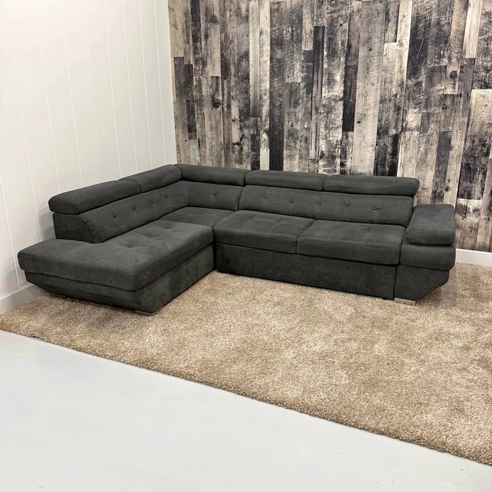 Adjustable headrests, adjustable armrest, pull-out sleeper, built-in storage, USB charging port, tufted seat design. Professionally steam cleaned with fabric shampoo and enzyme treatment. This sectional sofa / couch came from a non-smoking home with no stains, rips, or tears. Dimensions shown in the last photo.