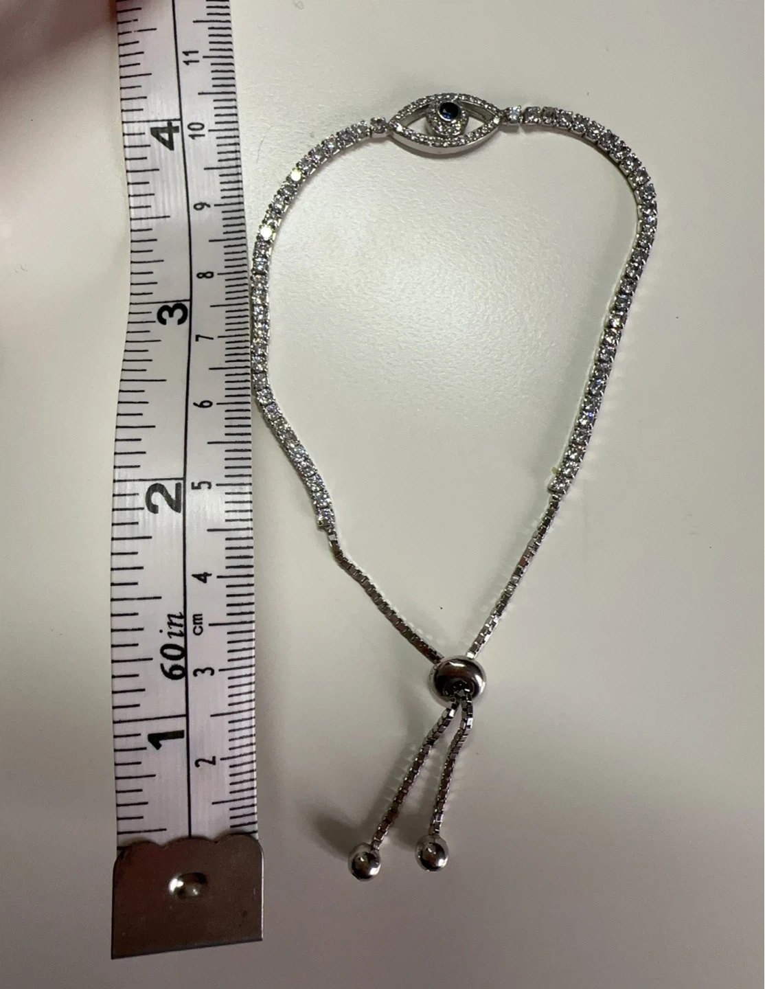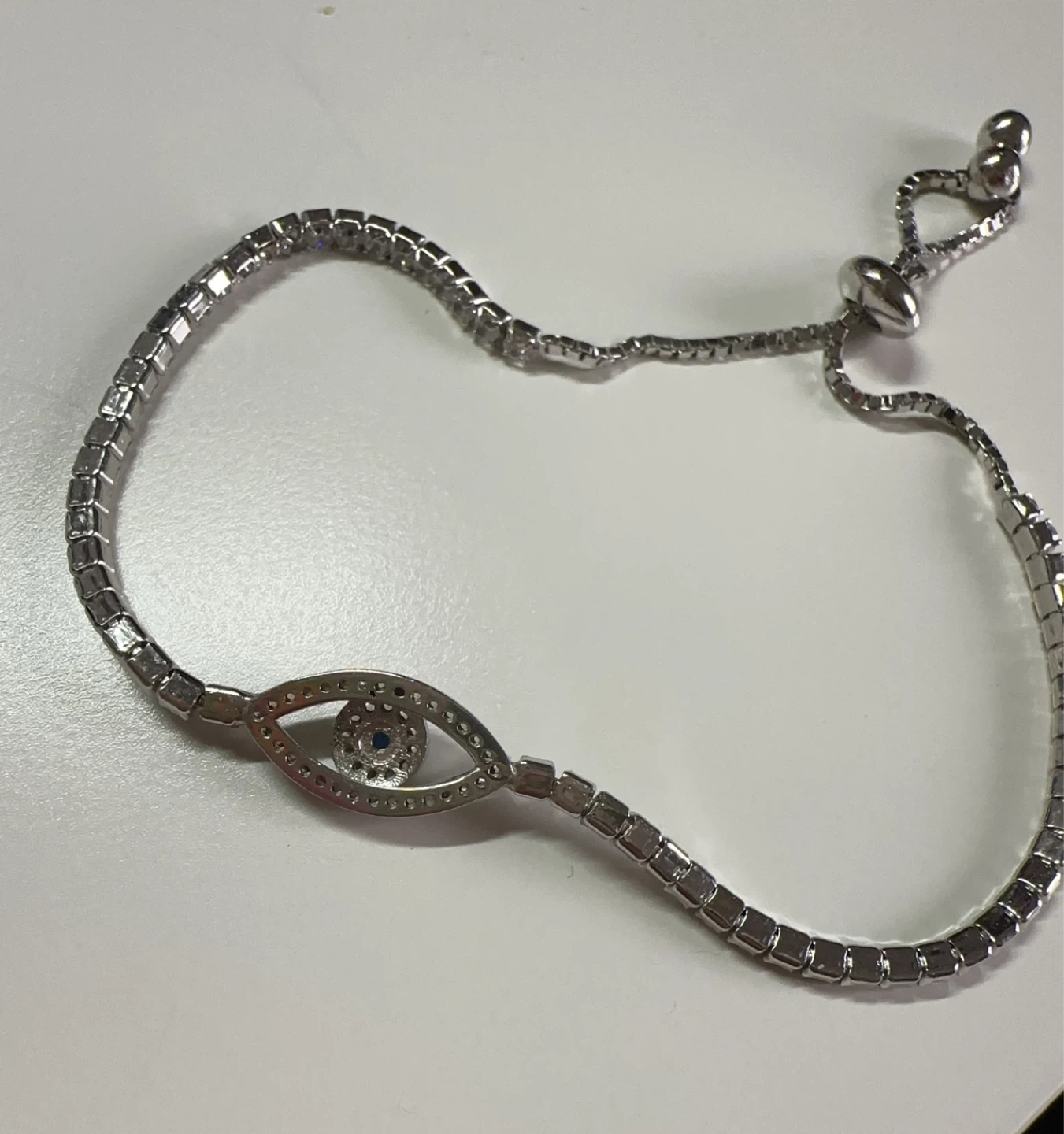 This sparkly tennis bracelet features an evil eye design with a small blue gem at its centre. It's adjustable for a comfy fit! Silver-toned metal with clear cubic zirconia stones.