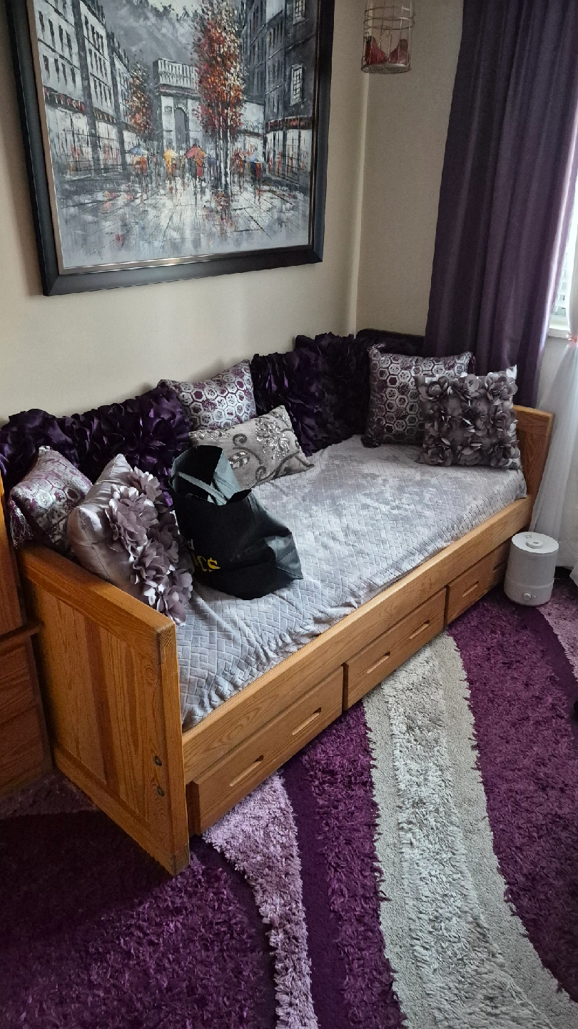 Selling a daybed that comes with drawers for extra storage! It's a great piece of furniture for a guest room or any space where you need a versatile seating and sleeping solution. The daybed is in good condition and ready for a new home. pull our drawers has 2nd new mattress for additional person to sleep.