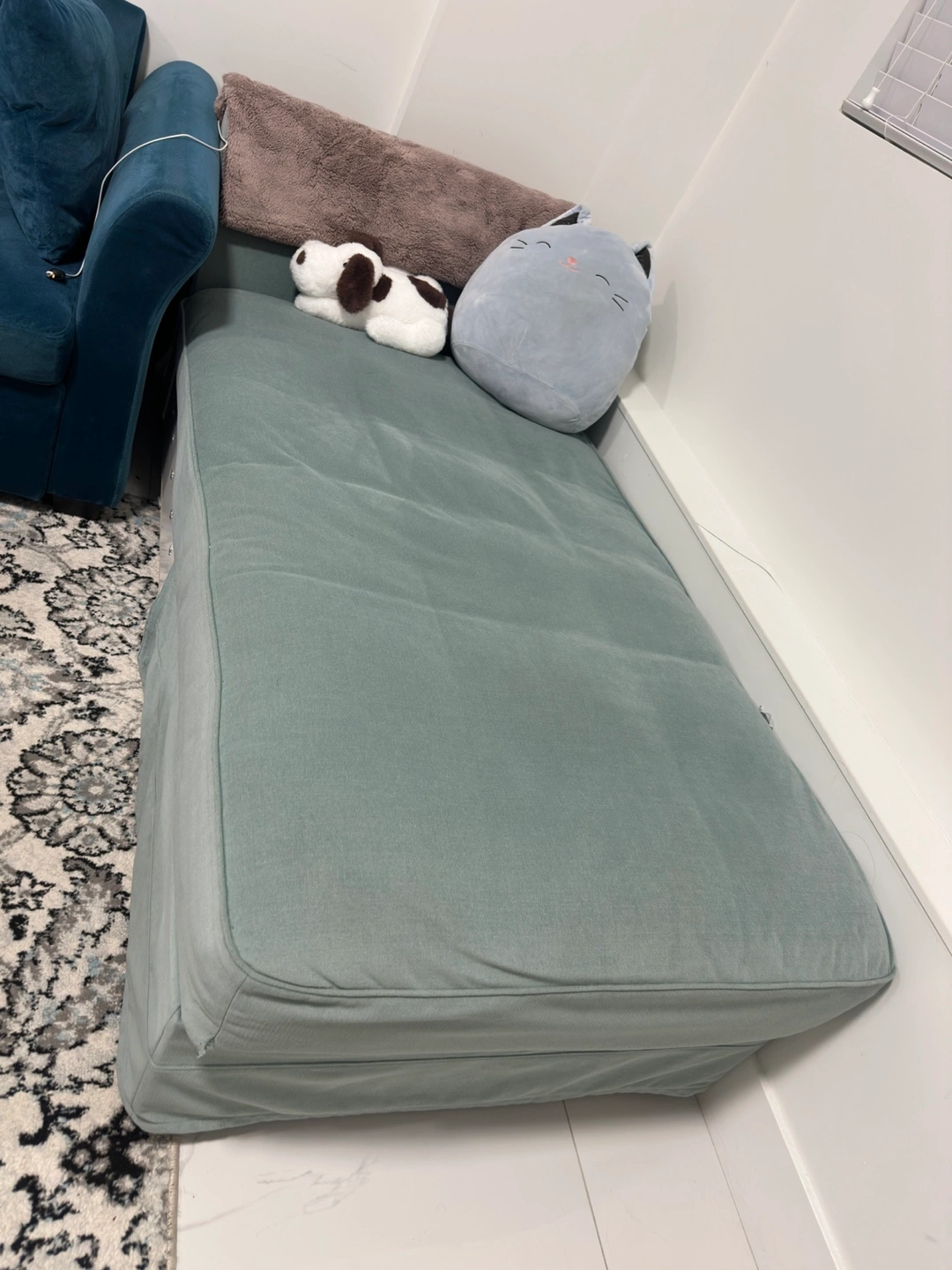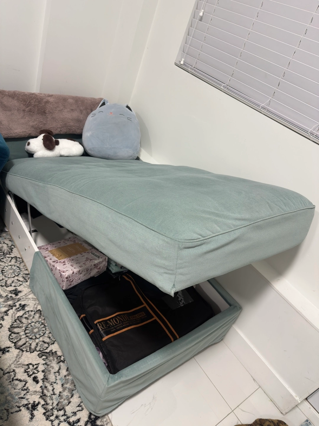 60Sage green daybed with storage. Pull-out storage compartment underneath. Great for small spaces. No rips/ damage to the couch, Comes from a pet free/ smoke free house