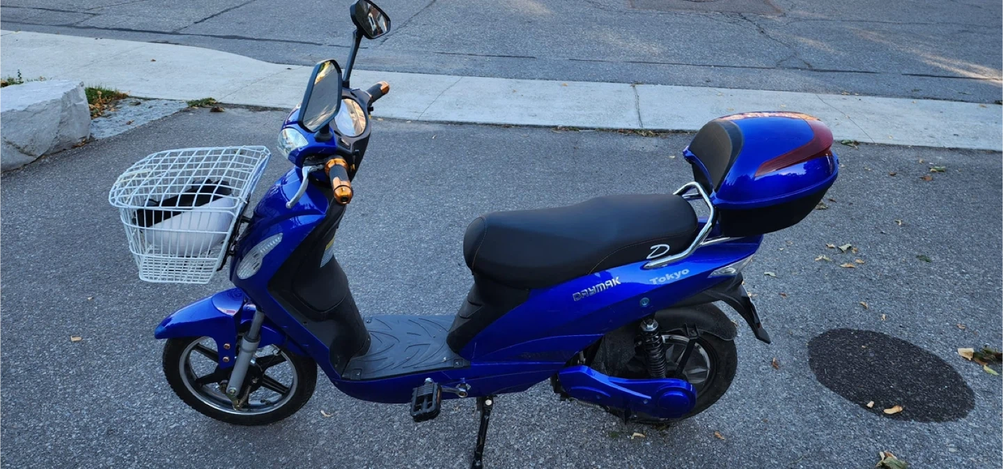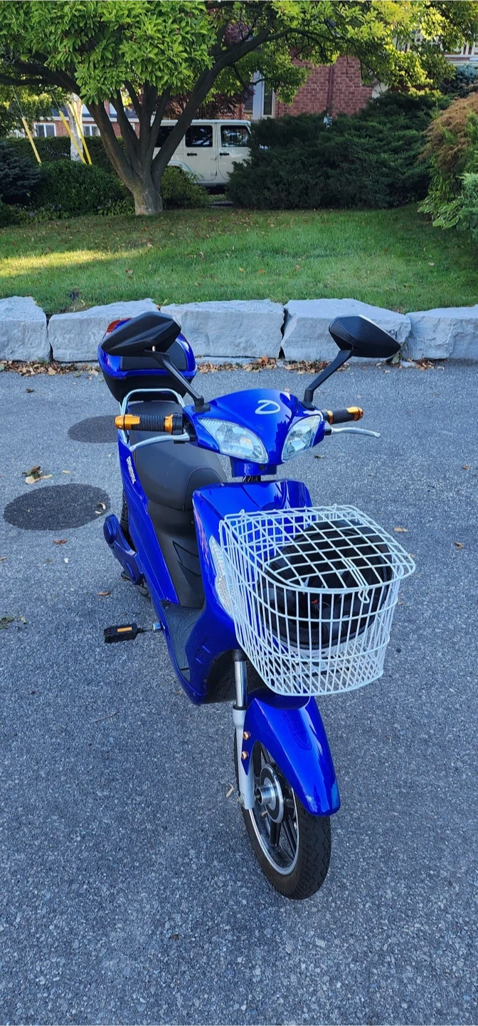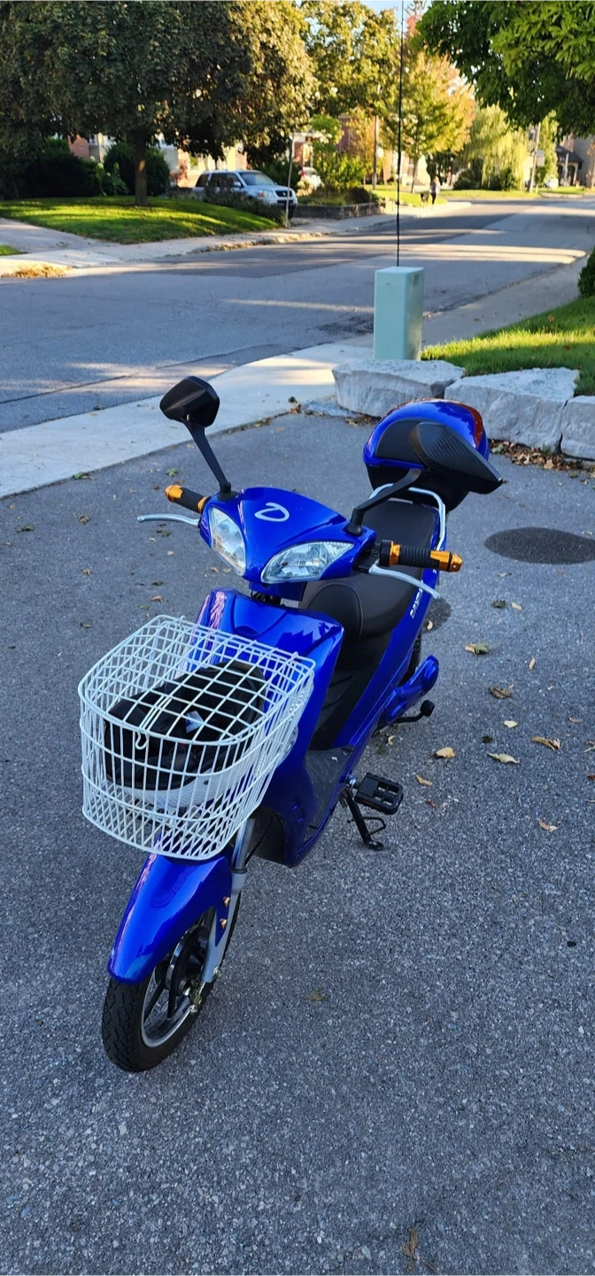 Selling a Daymak Tokyo electric bike in great condition! It's a vibrant blue and comes with a handy basket and storage compartment. Perfect for getting around town! Batteries replaced 8 months ago.