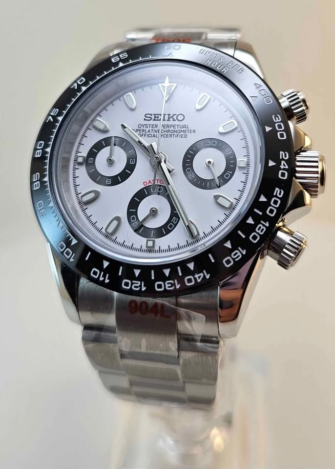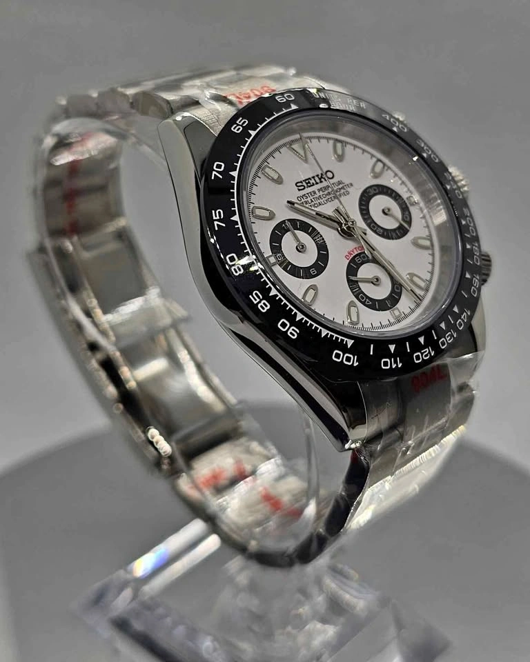 This is a custom Seiko mod built with the reliable VK63 chrono-quartz movement (chronograph +24 hour subdial). It’s styled after the famous Daytona, giving you that luxury look without the luxury price tag. Details: • Chrono-quartz Seiko VK63 movement • Stainless steel case & bracelet • Panda dial • Sapphire crystal • 24 hour subdial at 3 o’clock • Chronograph function • Steel screw caseback ✅ Runs great, keeps solid time, and has that sharp integrated-bracelet style that stands out on the wrist. 🔧 Custom Mods Available I also build Seiko mods by request — different dials, bezels, cases, you name it. • $100 deposit required • 2–3 week turnaround Let me know if you're interested!