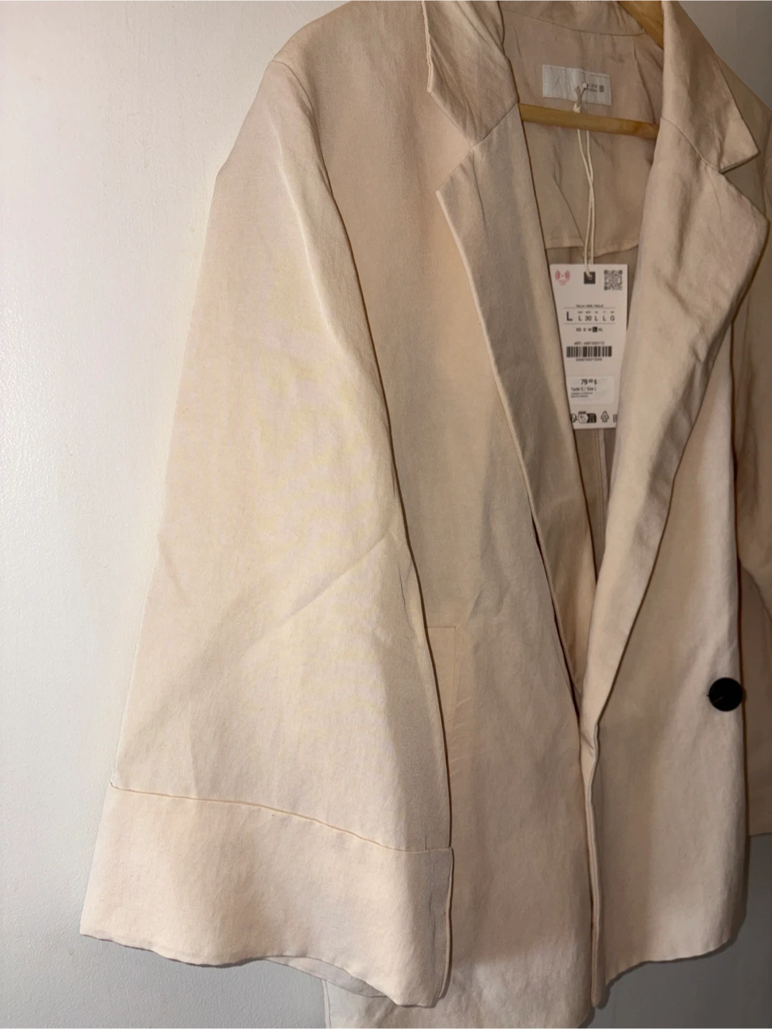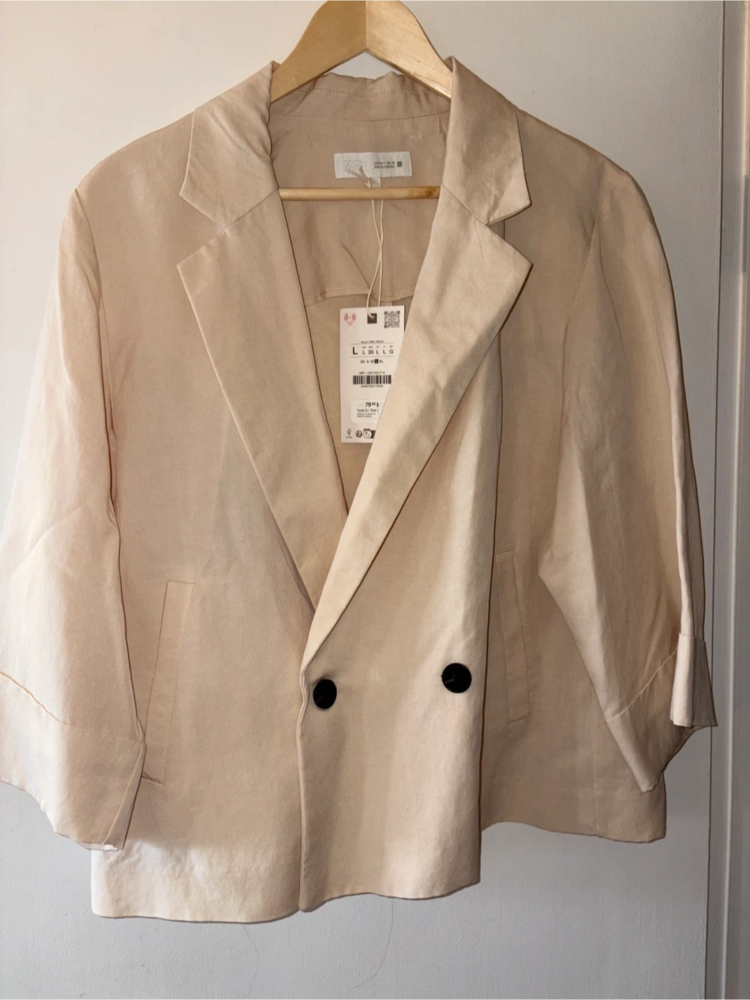 A beige double-breasted French cut blazer from ZARA. This jacket features a relaxed fit and three-quarter sleeves. It's made from a lightweight fabric and has black buttons. A versatile piece for your wardrobe!