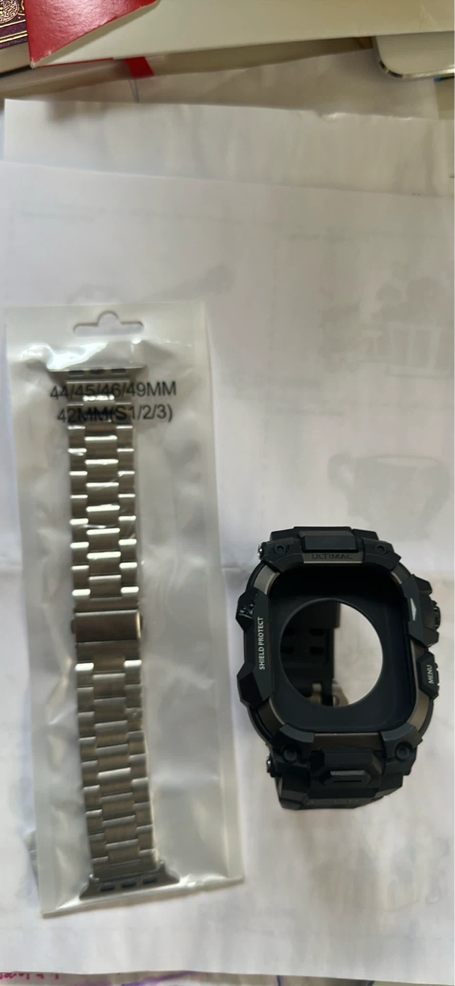 Stainless steel watch band compatible with 44/45/46/49mm and 42mm Apple Watch models. Also includes a black protective case labelled 'ULTIMAL' and 'SHIELD PROTECT'. The band comes in its original packaging.