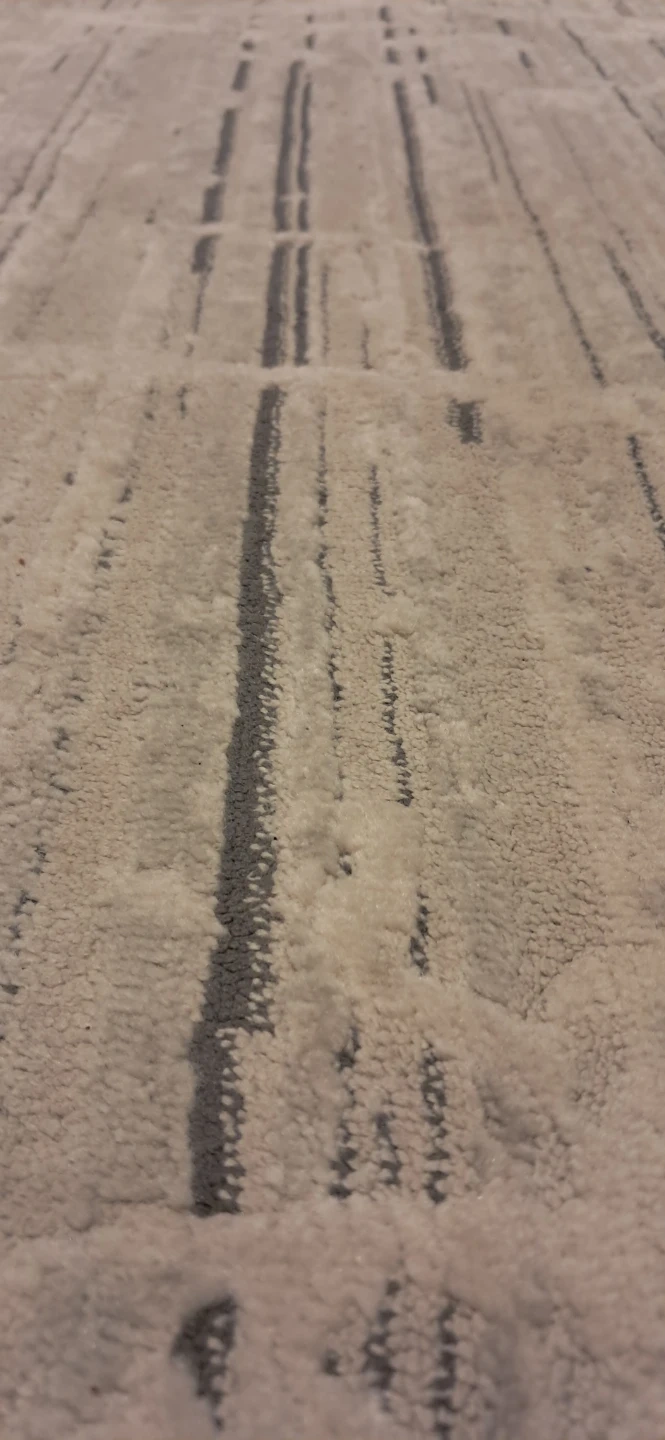 Cream and grey patterned area rug. Soft texture and a modern design. This rug would work well in a living room or bedroom. Moving Sale!!