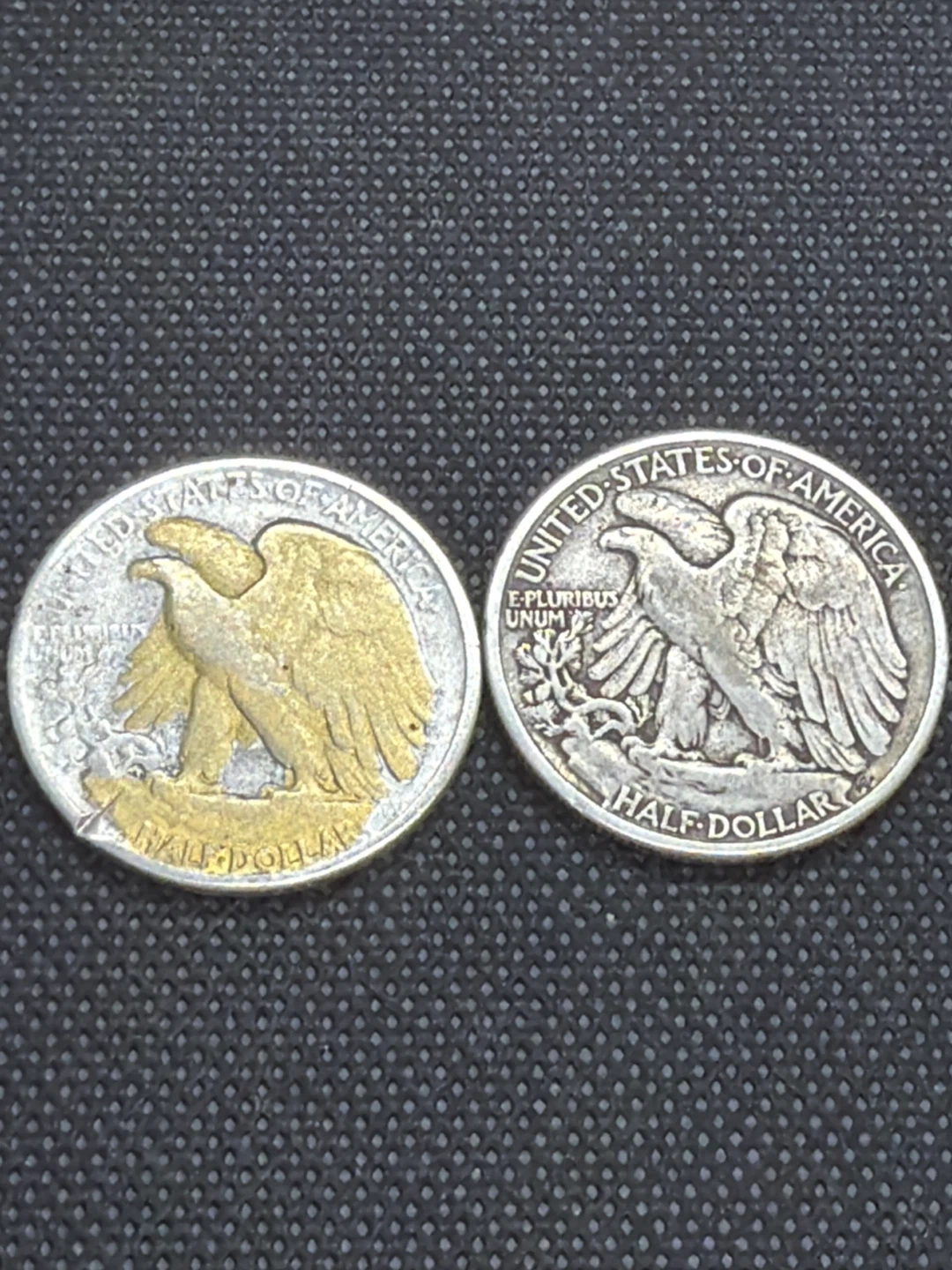Two United States Walking Liberty half dollars are shown. One coin has a gold-tone finish, while the other appears to be standard silver. Both coins depict an eagle in flight on one side and a figure of liberty on the other.