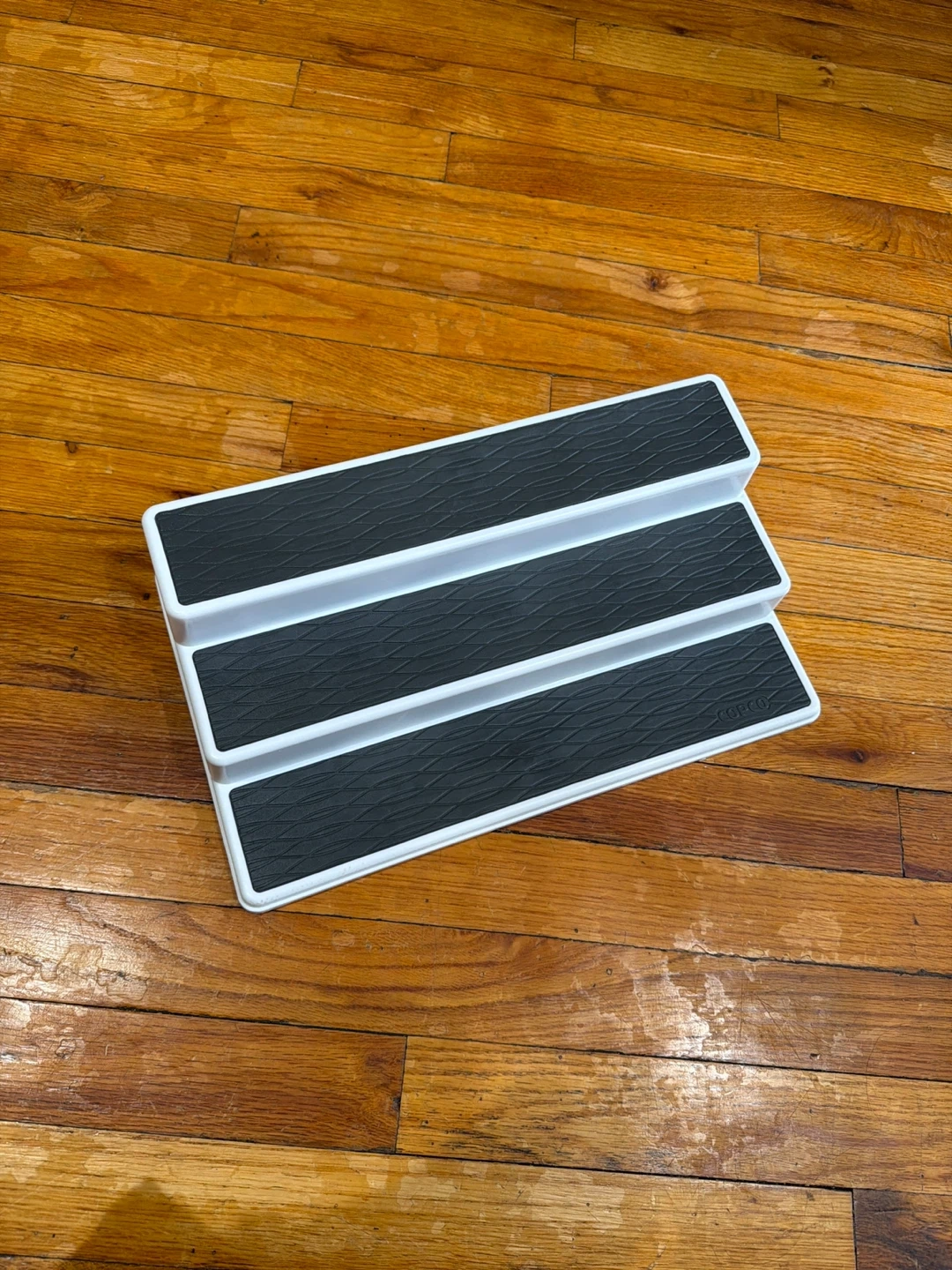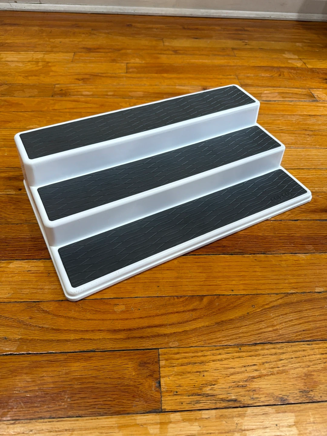 White 3-tier stepped organizer. Features black textured grip surfaces on each step. It's perfect for spices or organizing small items in cabinets or pantries! Measures 15" wide, 8" deep, and 3.5" high.