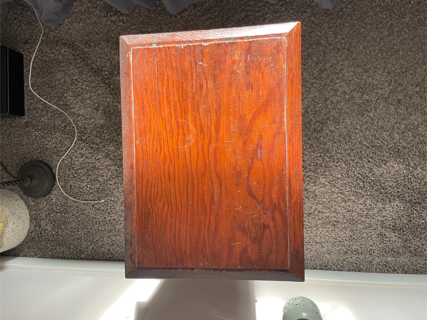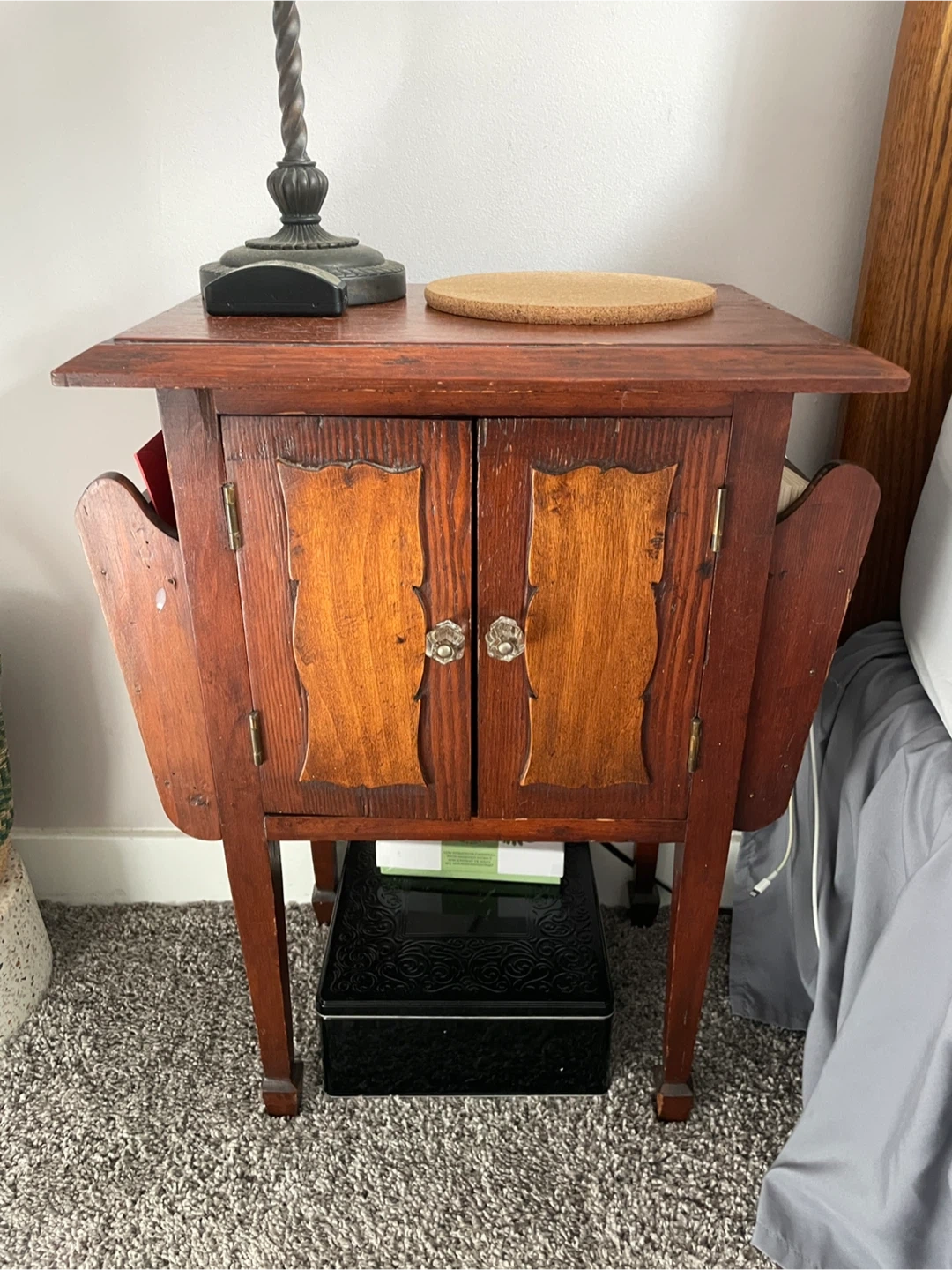 A wooden table with two side pockets for magazines and a small cabinet with two doors. Made of dark stained wood with clear knobs. A charming piece for holding reading materials and small items. Perfect for a cozy living room or as a bedside table!