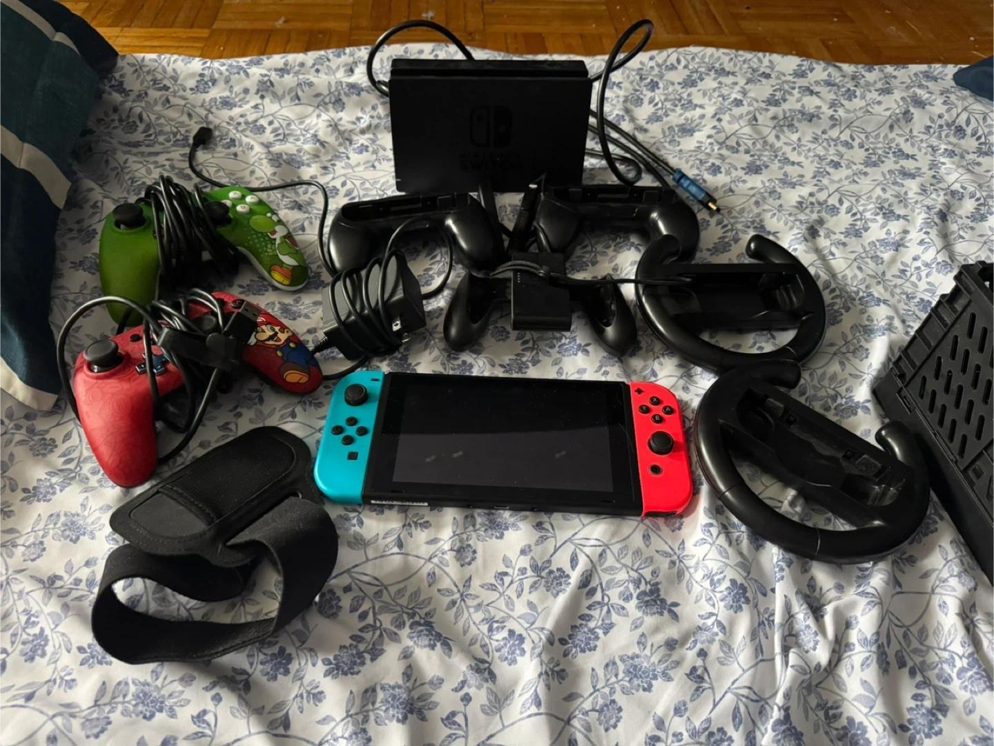 Nintendo Switch console with blue and red Joy-Cons. Includes two steering wheels and multiple controllers. Lots of fun for racing games!