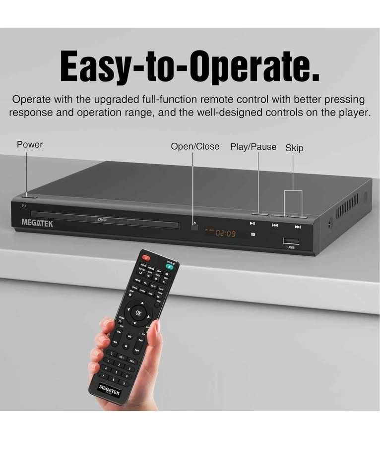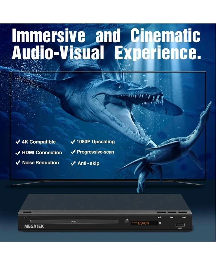 Versatile MEGATAK DVD player. Plays DVDs, CDs, USB media, and MP3s. It's multi-region so plays DVDs from all zones. Has 4K compatible and 1080P upscaling for a great picture. HDMI connection, progressive-scan, noise reduction, and anti-skip features too. Comes with remote and HDMI cables. No Blu-ray disc support.