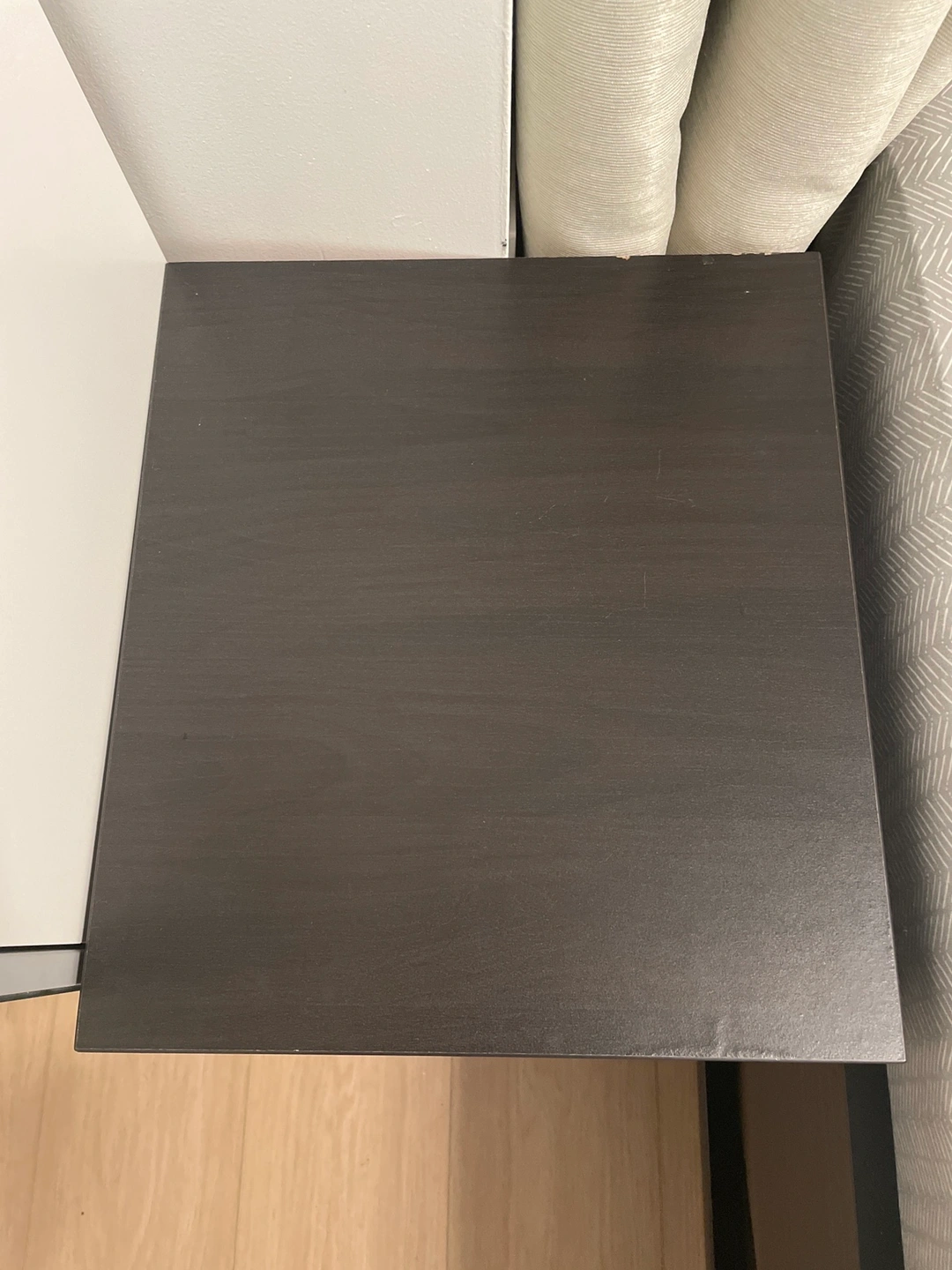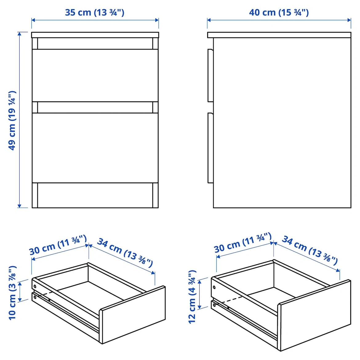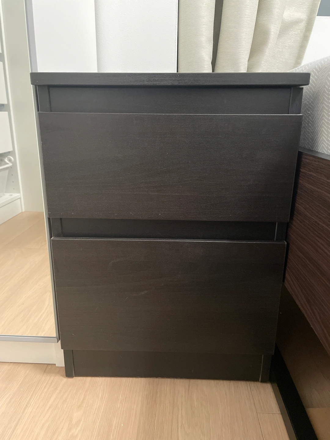 One nightstand with two drawers in dark brown finish. Dimensions are 35cm wide, 40cm deep, 49cm high.