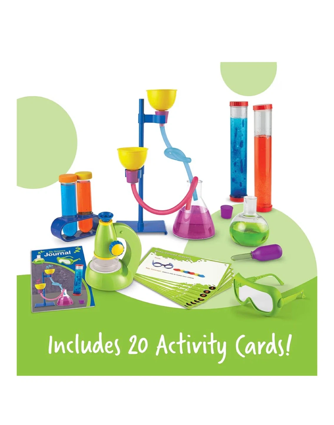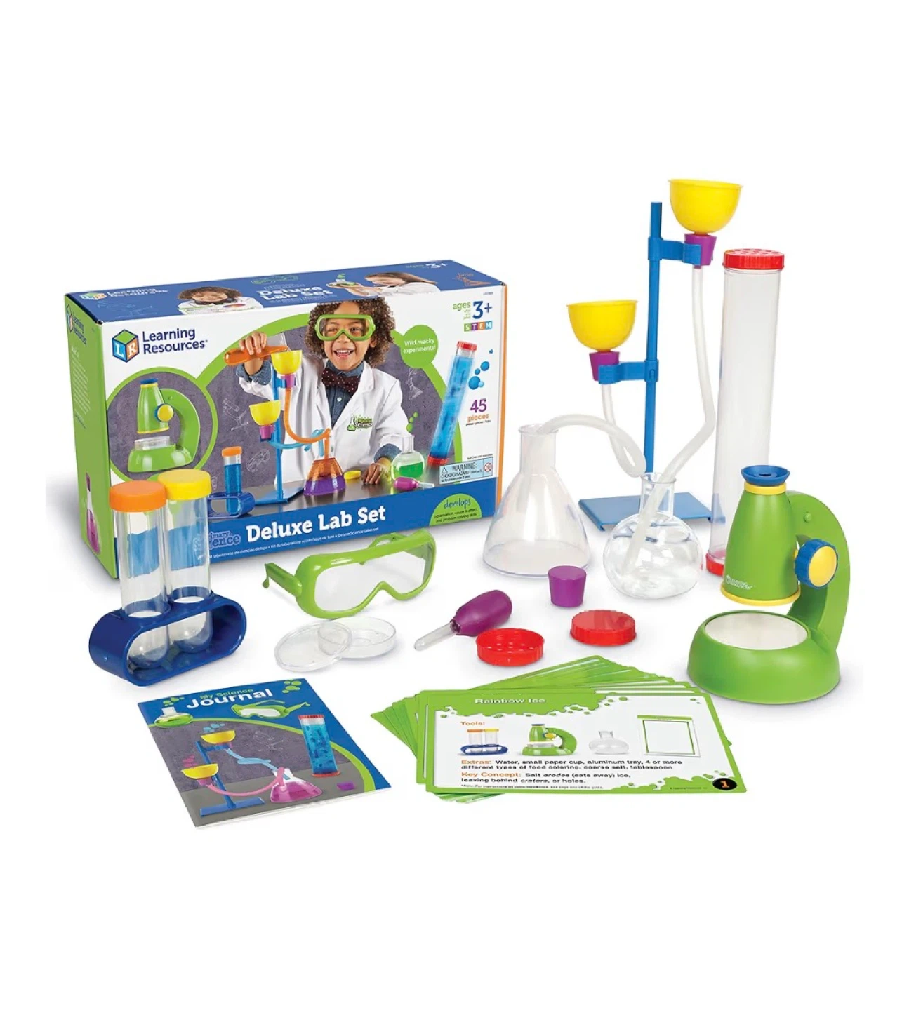 This 45-piece science lab set is designed for kids ages 3 and up. It includes a stand, funnels, tubes, beakers, safety glasses, a journal, and 20 activity cards. It's great for encouraging early STEM learning through hands-on experiments!