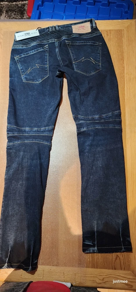 Selling a pair of Paracco moto-style jeans in a dark wash. They have a unique design with ribbed detailing on the thighs and knees. These jeans are BNWT