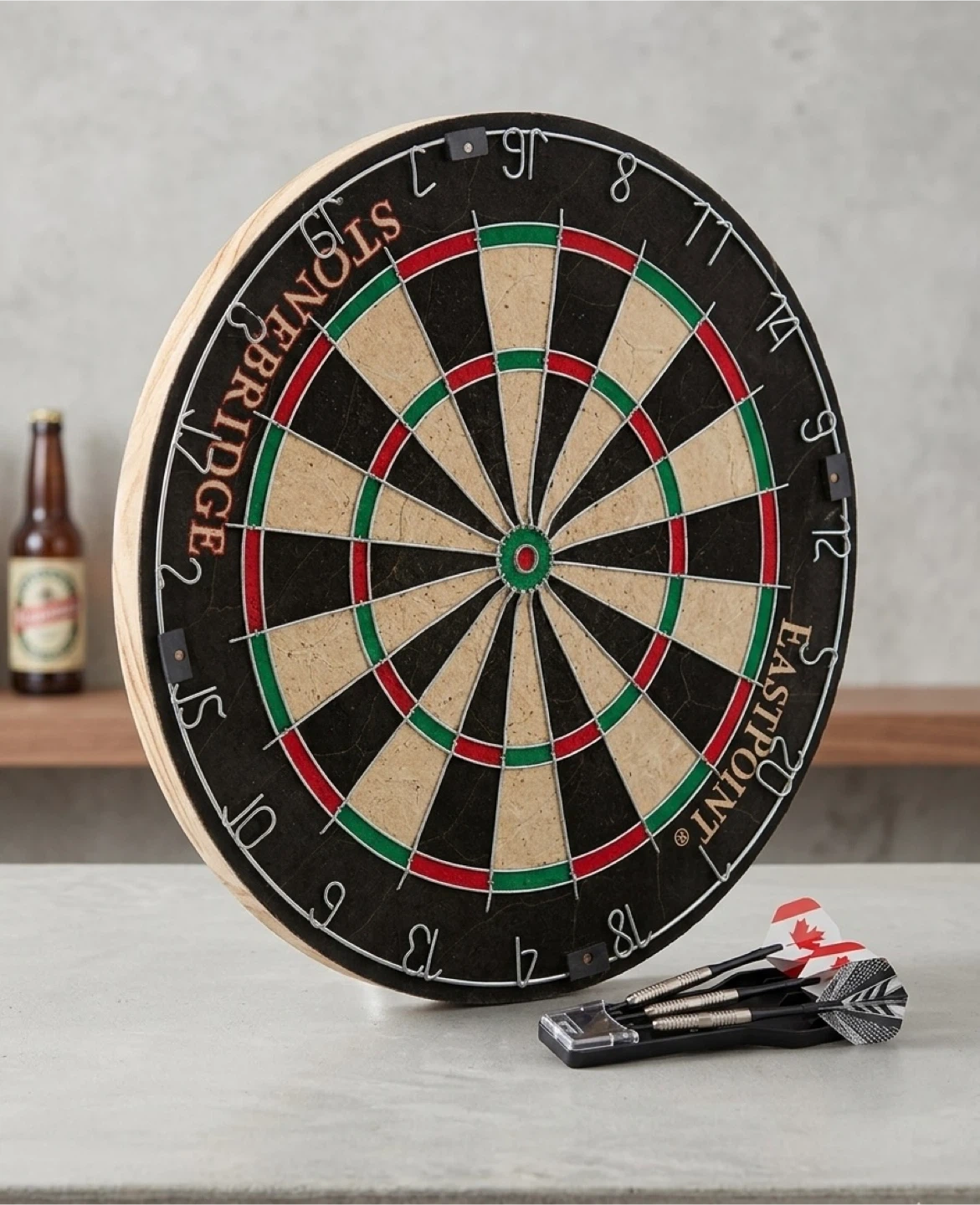 This Eastpoint Stonebridge dartboard is a classic addition to any game room. It features a traditional bristle surface with visible scoring numbers. Includes a set of darts.