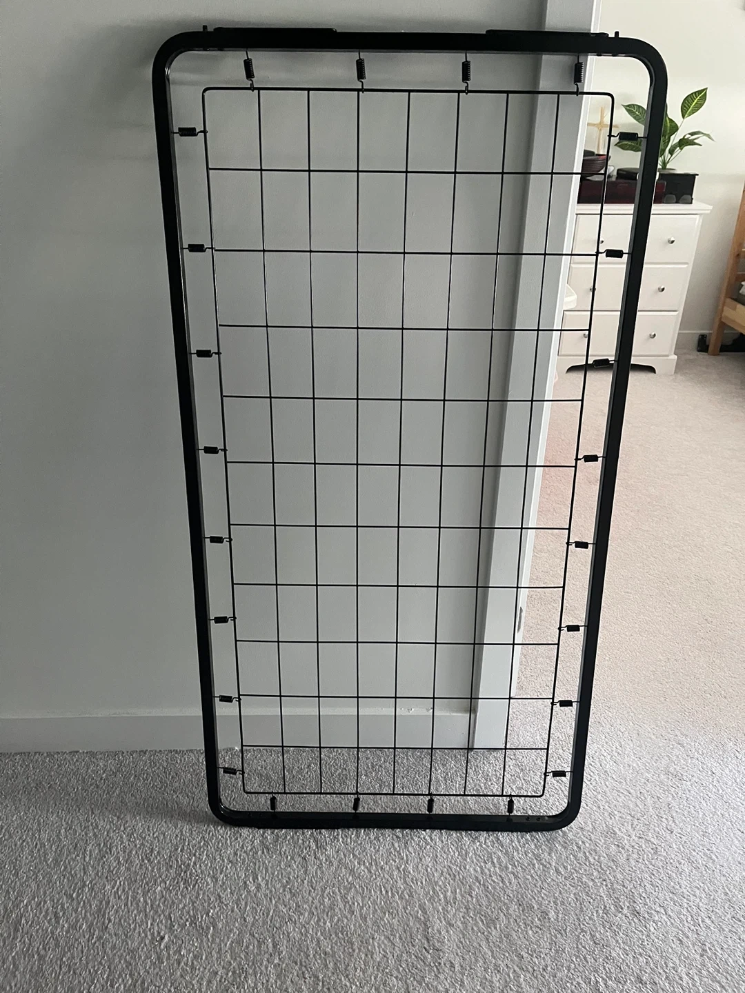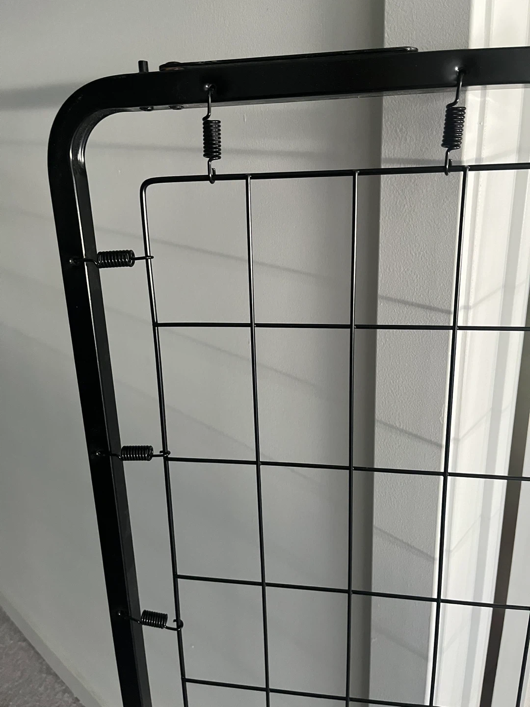 This is a black metal bed frame base for a crib. . It's a wire grid design with a sturdy metal frame and spring supports. It's suitable for supporting a mattress directly.