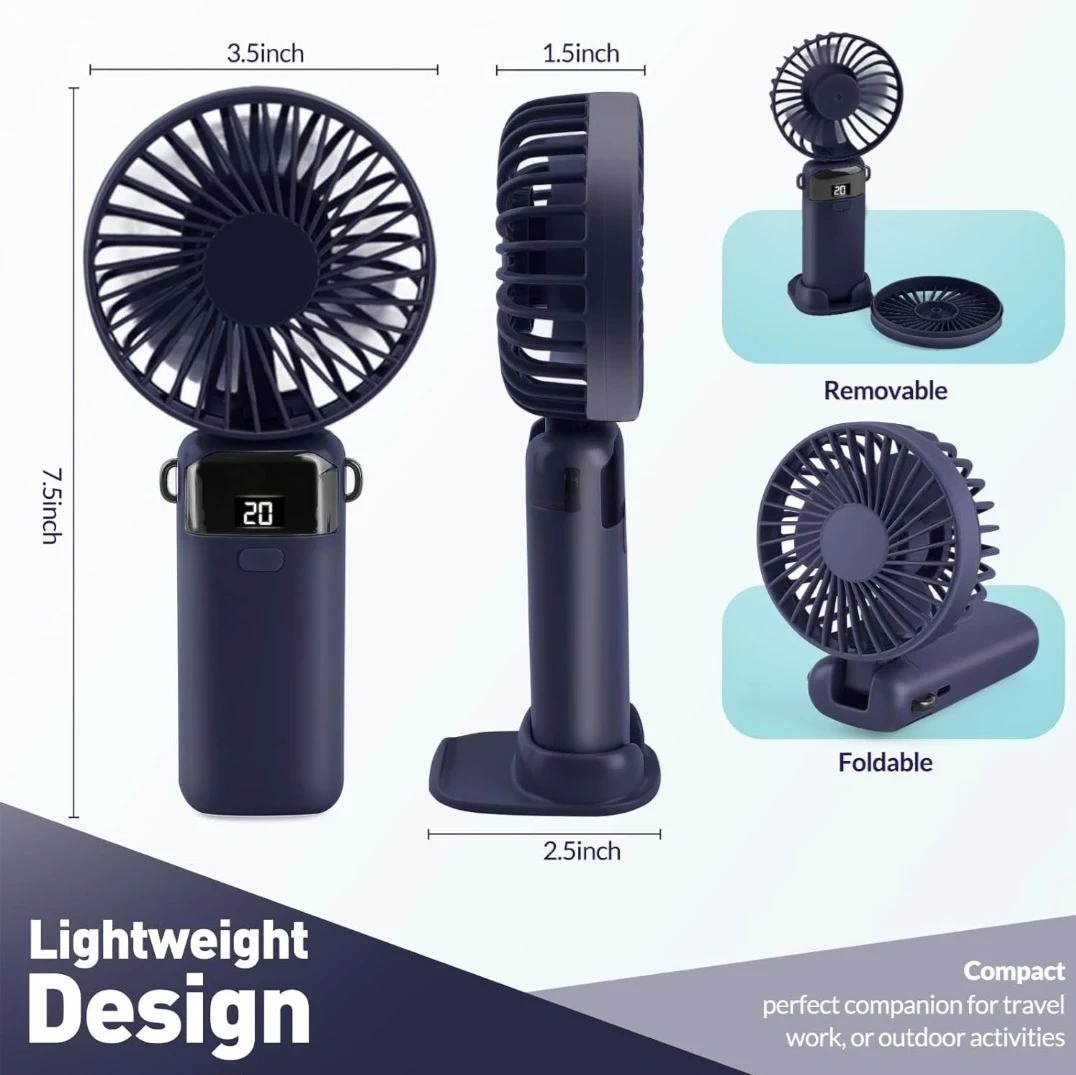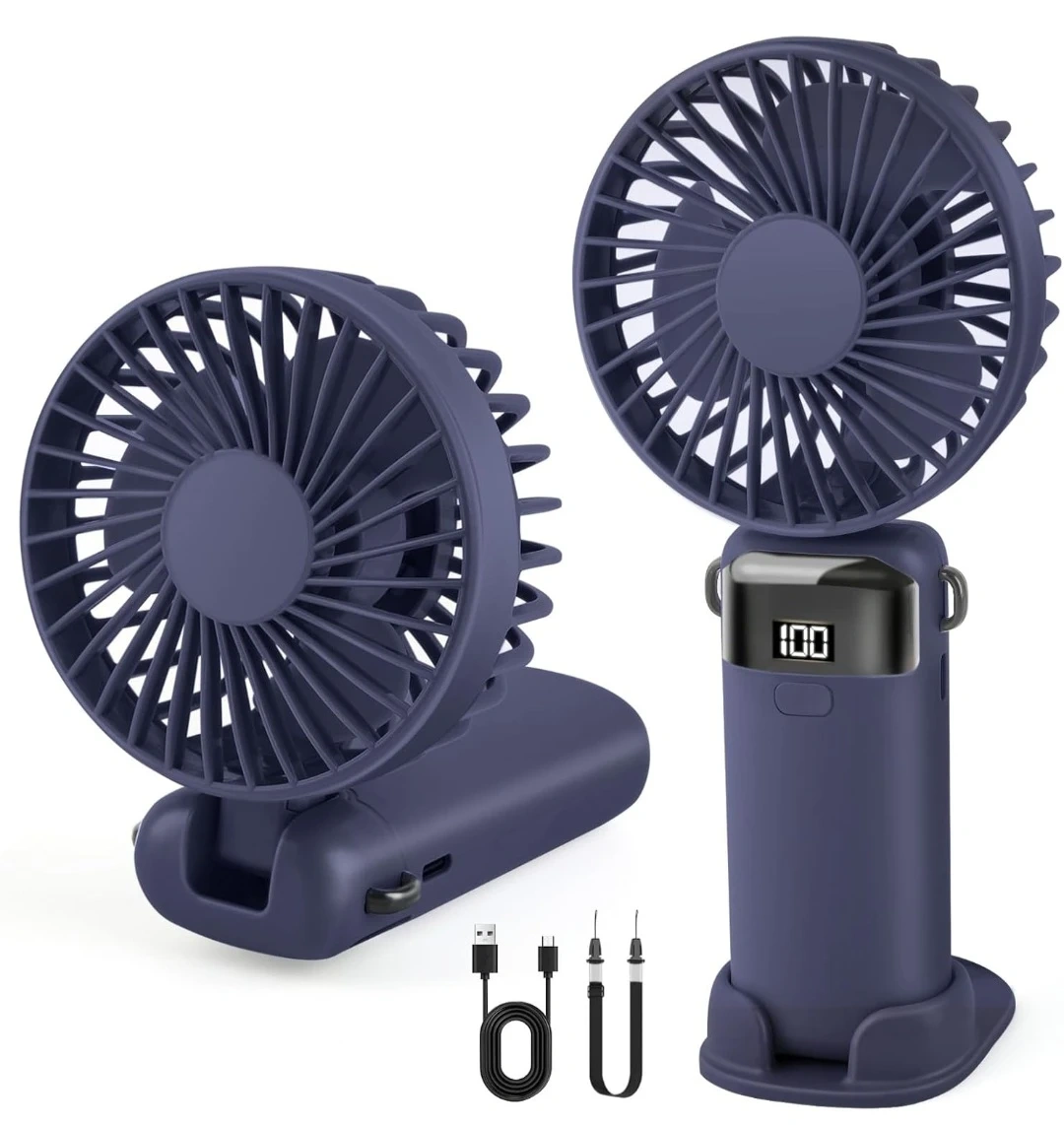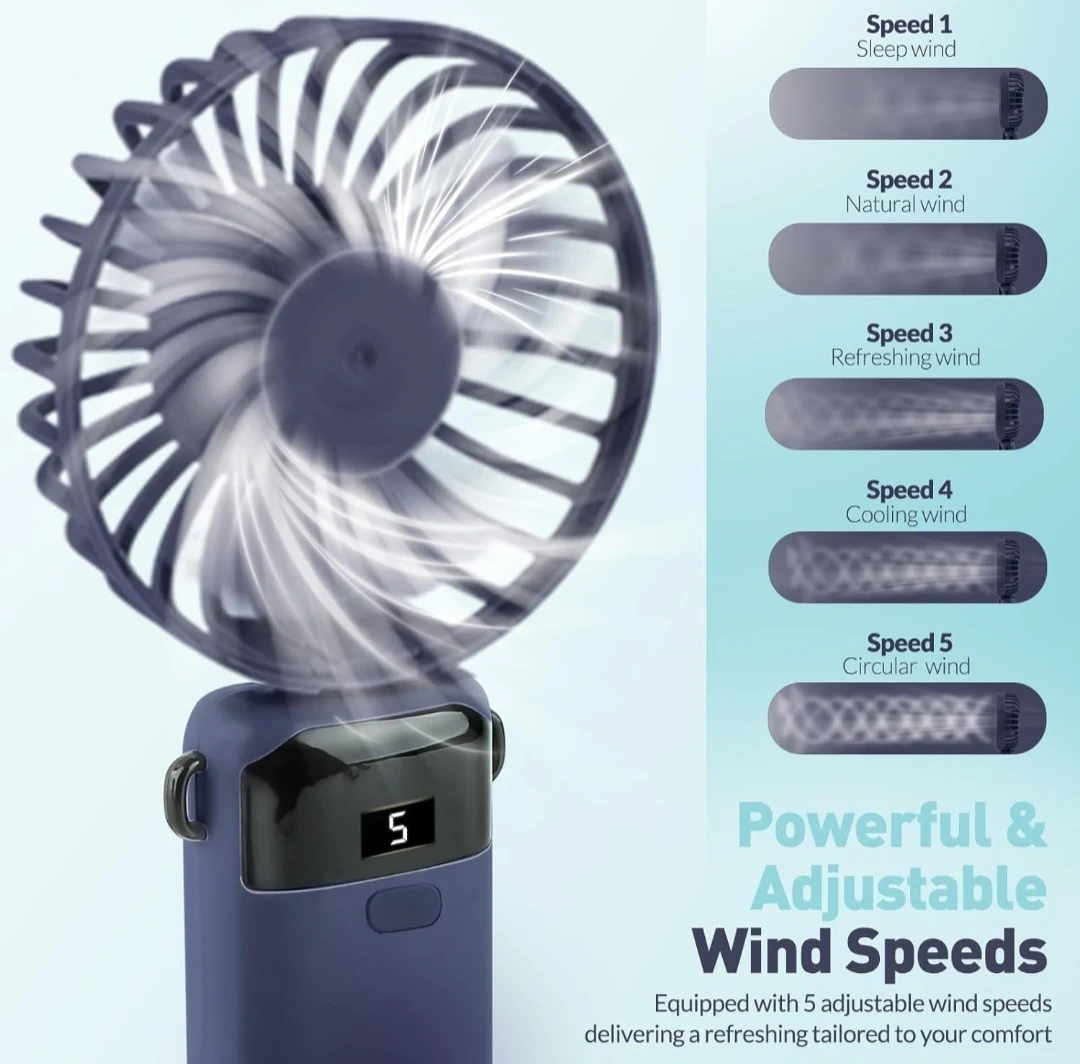 Portable Handheld Fan Rechargeable Small Fan 5 Speeds with Lanyard and Base USB Desk Fan Foldable Quiet Personal Fan with LED Display for Office, Home, Travel, Outdoor.