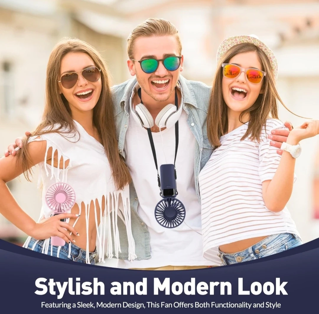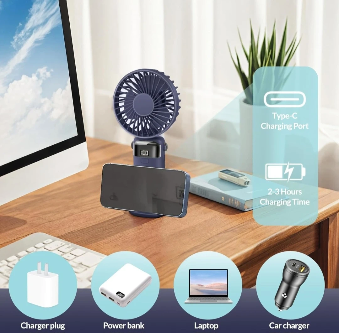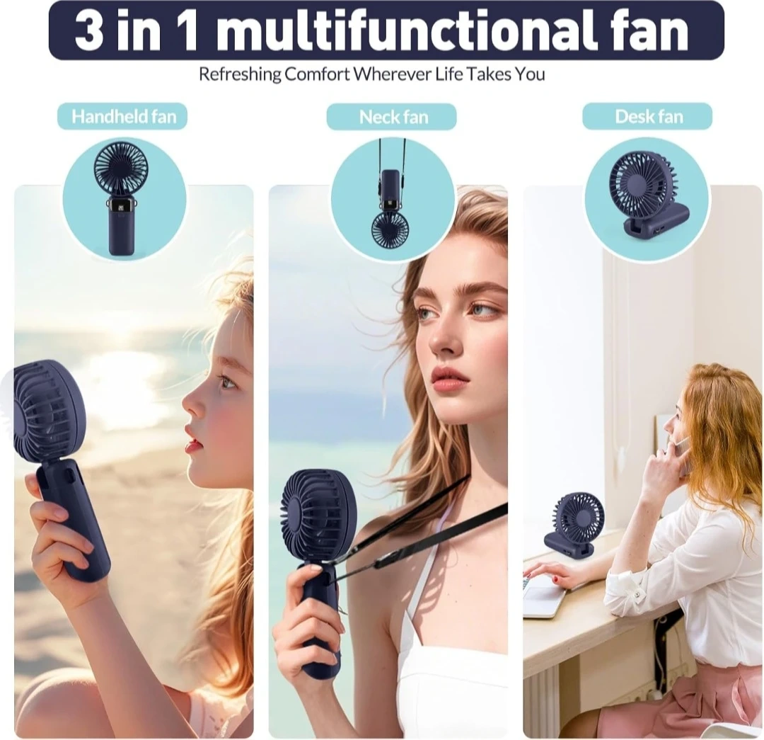 Portable Handheld Fan Rechargeable Small Fan 5 Speeds with Lanyard and Base USB Desk Fan Foldable Quiet Personal Fan with LED Display for Office, Home, Travel, Outdoor.
