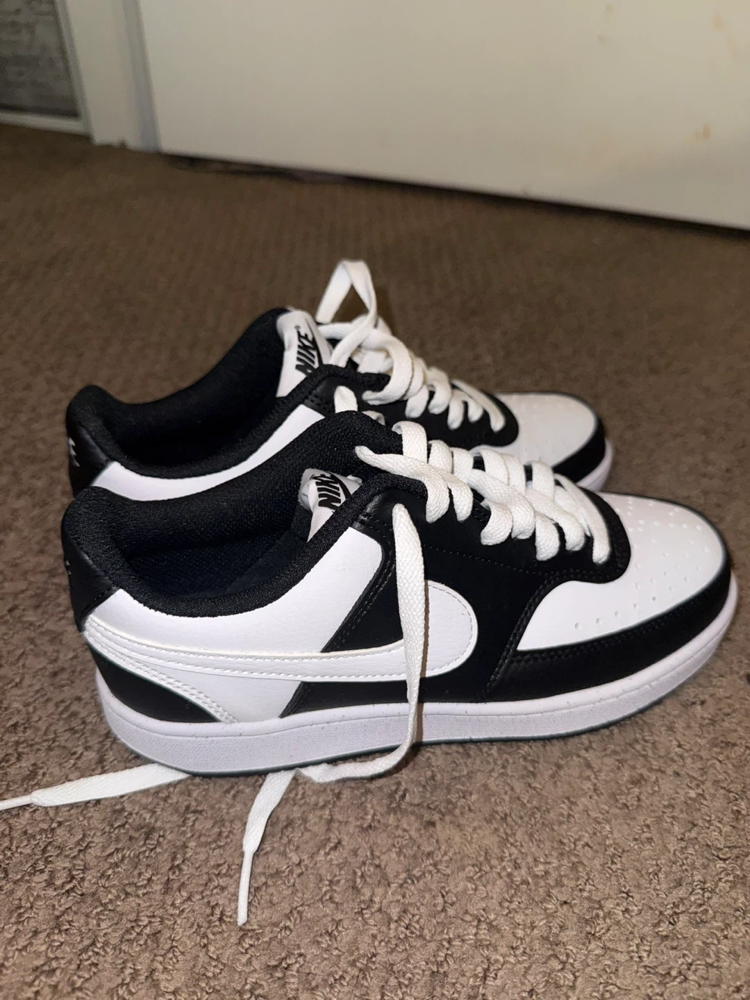 These Nike Court Vision Low sneakers are a classic black and white colourway. They feature a durable rubber sole and comfortable cushioning. Perfect for everyday wear or hitting the court!