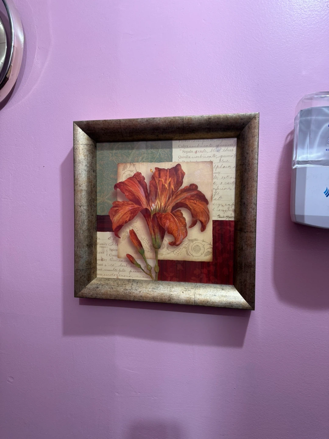 Decorative framed artwork featuring a vibrant orange lily and botanical text. Frame has a metallic, textured finish. Adds a touch of nature-inspired elegance to any room!