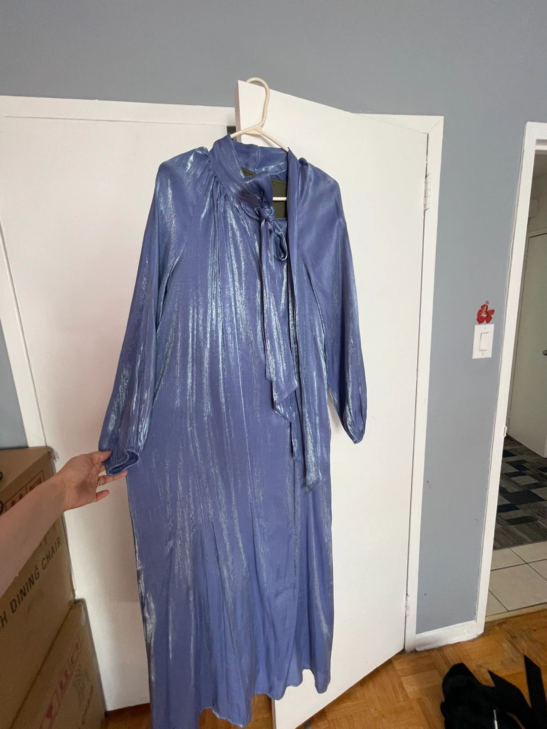 This is a long blue dress with metallic It has long, voluminous sleeves and a tie detail at the neck. The dress falls to the floor. It's made of a shimmery fabric.