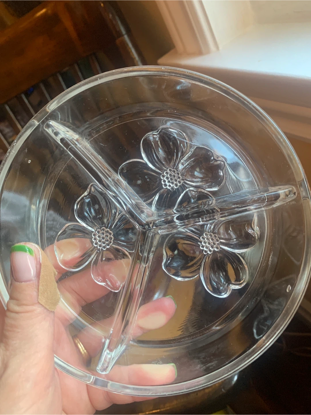 This clear vintage glass candy dish features a decorative lid with embossed pink dogwood flowers and a pretty textured glass knob. Made in the 1940’s-1950’s by Colony Glass. It's divided into three sections inside. The dogwood blossoms are embossed at the bottom as well. There are no chips or cracks. It's a pretty piece for serving treats, candies or displaying small items like jewelry!