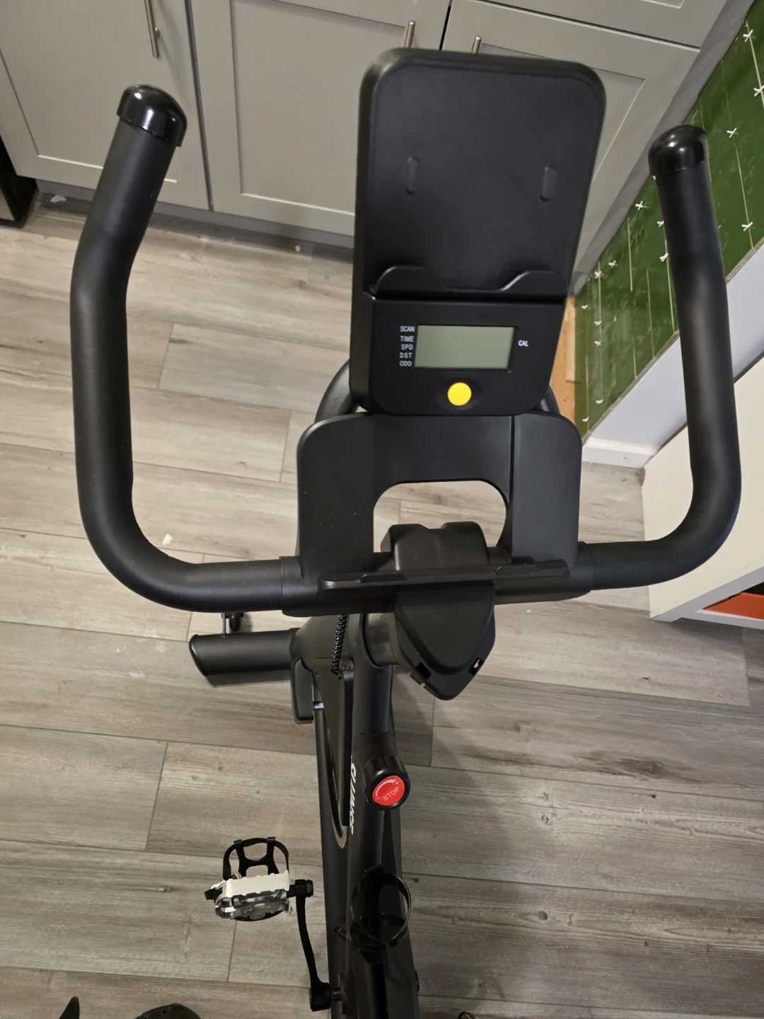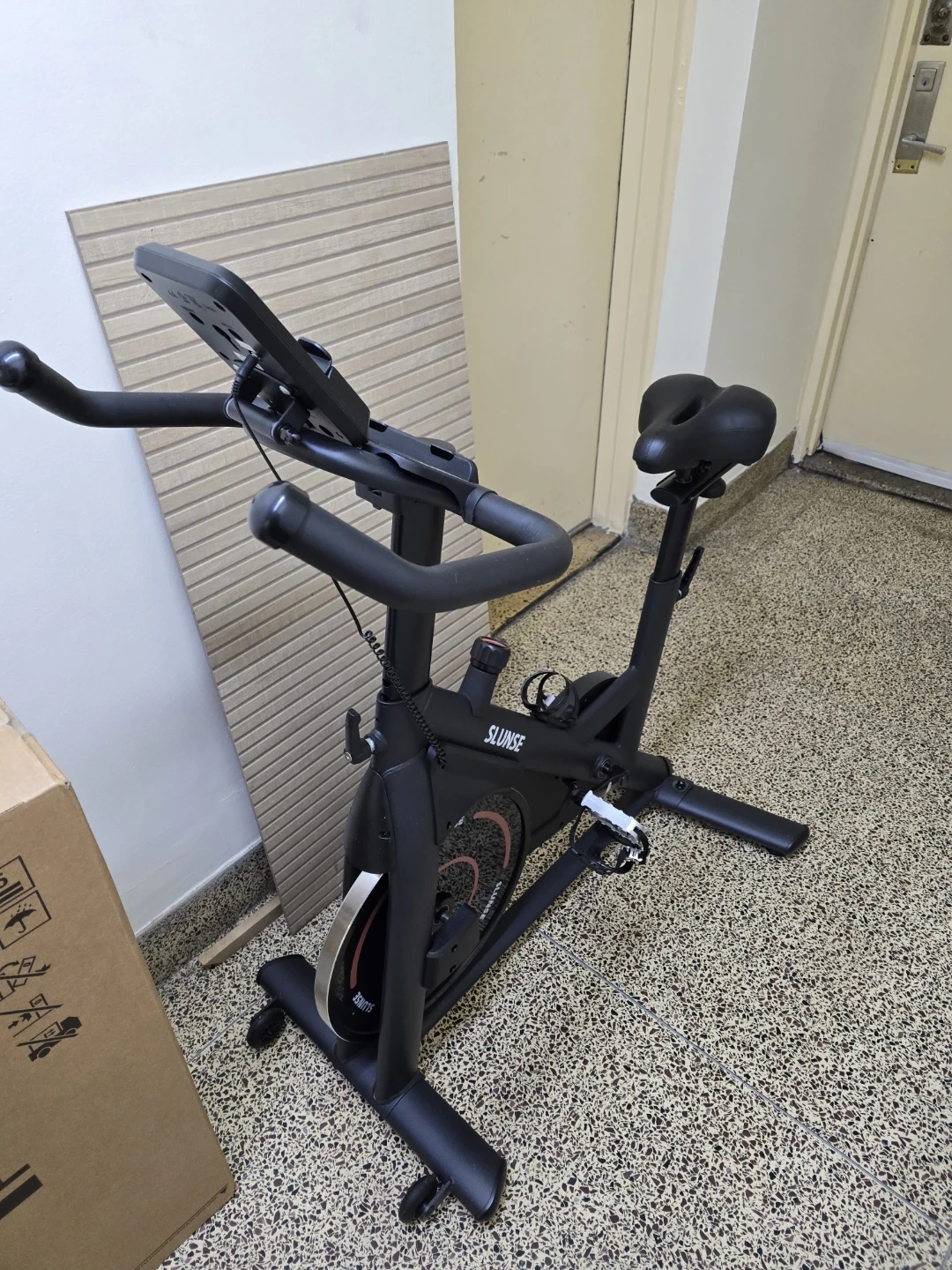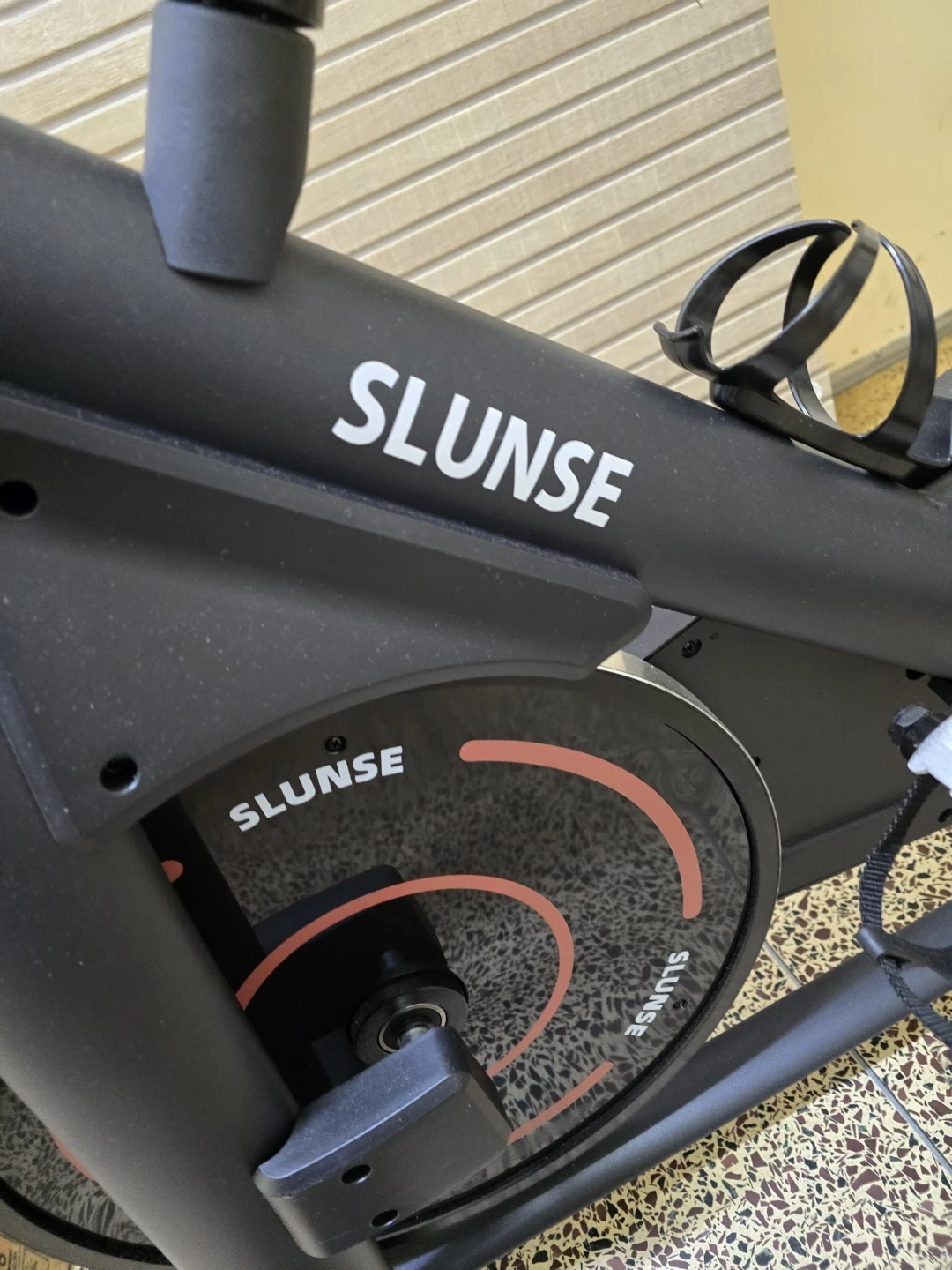 This is a SLUNSE brand stationary exercise bike. It's black and features adjustable seat and handlebars. The display shows scan, speed, time, distance, and calories. Includes a water bottle holder.