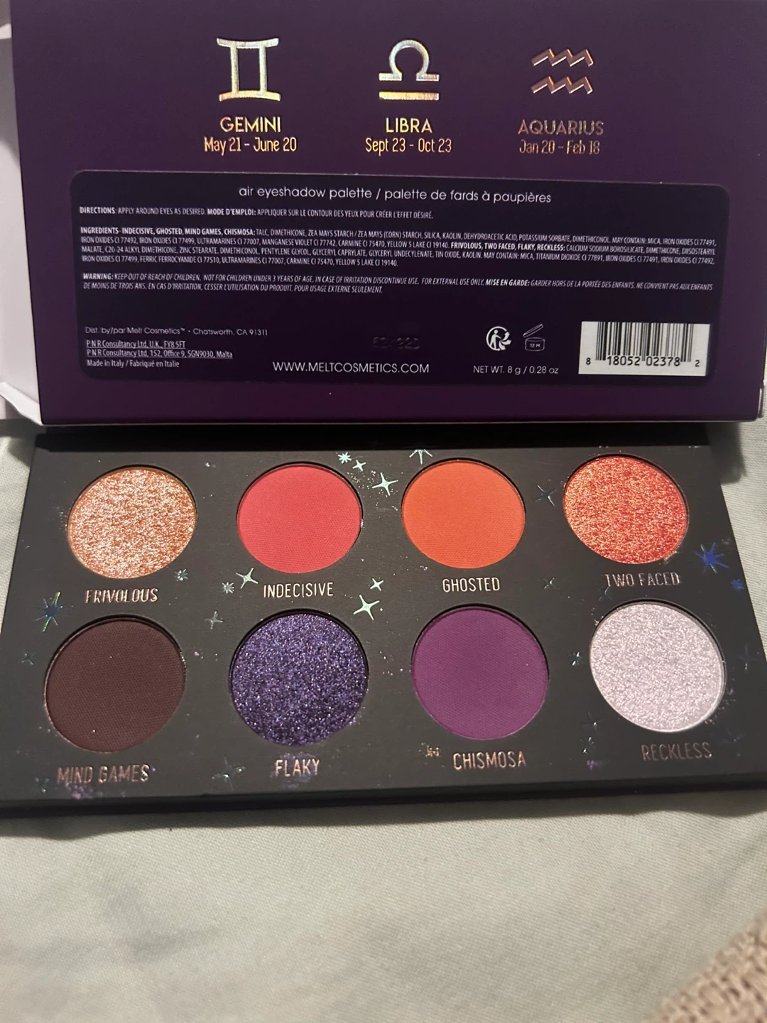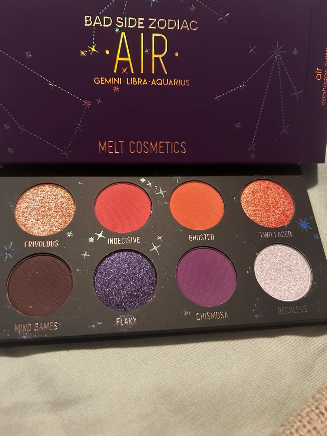Selling a Melt Cosmetics eyeshadow palette from the Bad Side Zodiac collection, specifically the Air palette (Gemini, Libra, Aquarius). The palette includes a variety of shades with names like Frivolous, Indecisive, Ghosted, Two Faced, Mind Games, Flaky, Chismosa, and Reckless. Net weight: 8 g / 0.28 oz