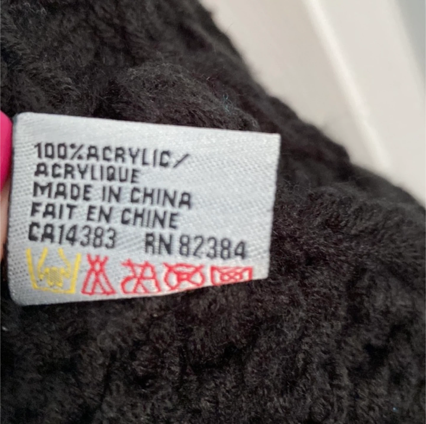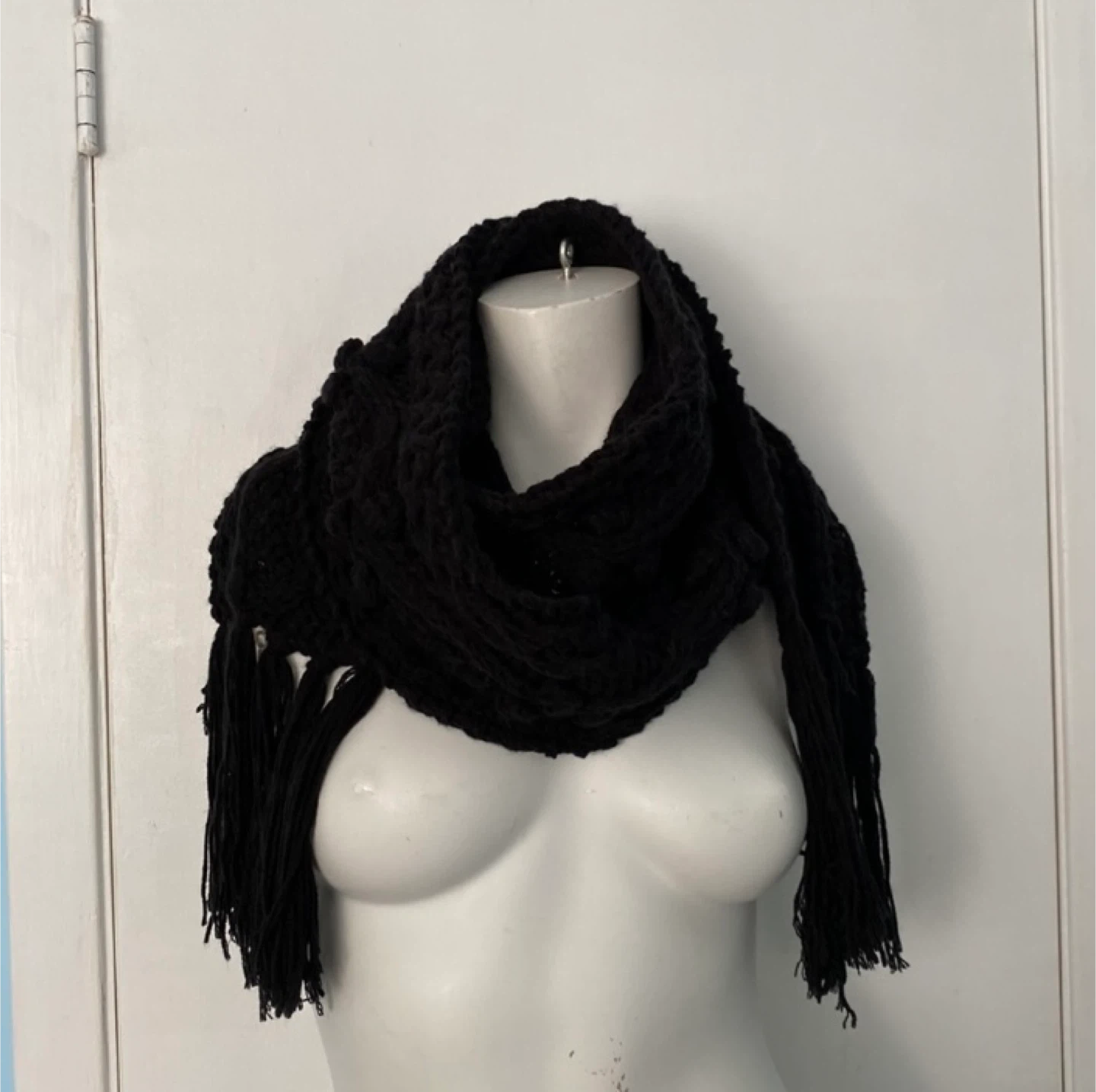 Warm black knit scarf made from 100% acrylic. It features a textured design and is finished with fringed edges. This scarf is perfect for adding a cozy touch to your winter outfits!
