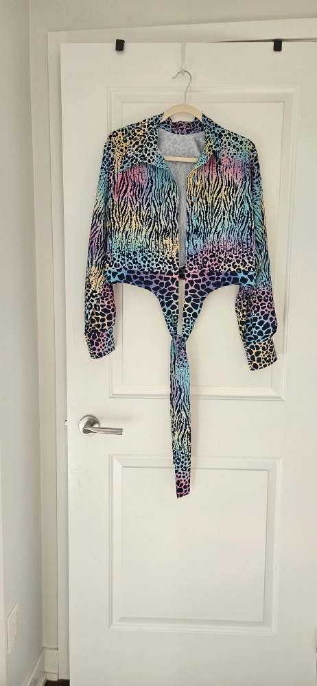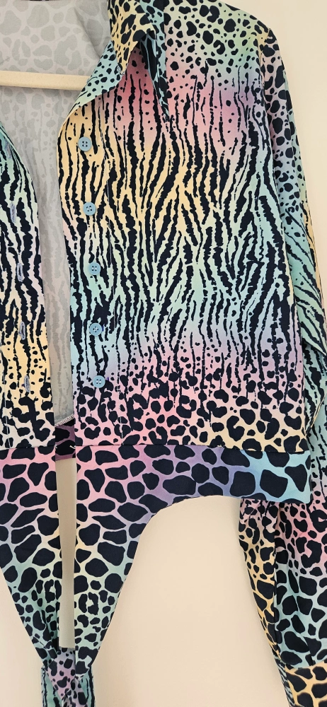 Fun and funky animal print tie front top! Size Medium. This top features a unique blend of zebra and leopard prints in a cool rainbow gradient. Perfect for adding a pop of colour to your wardrobe.