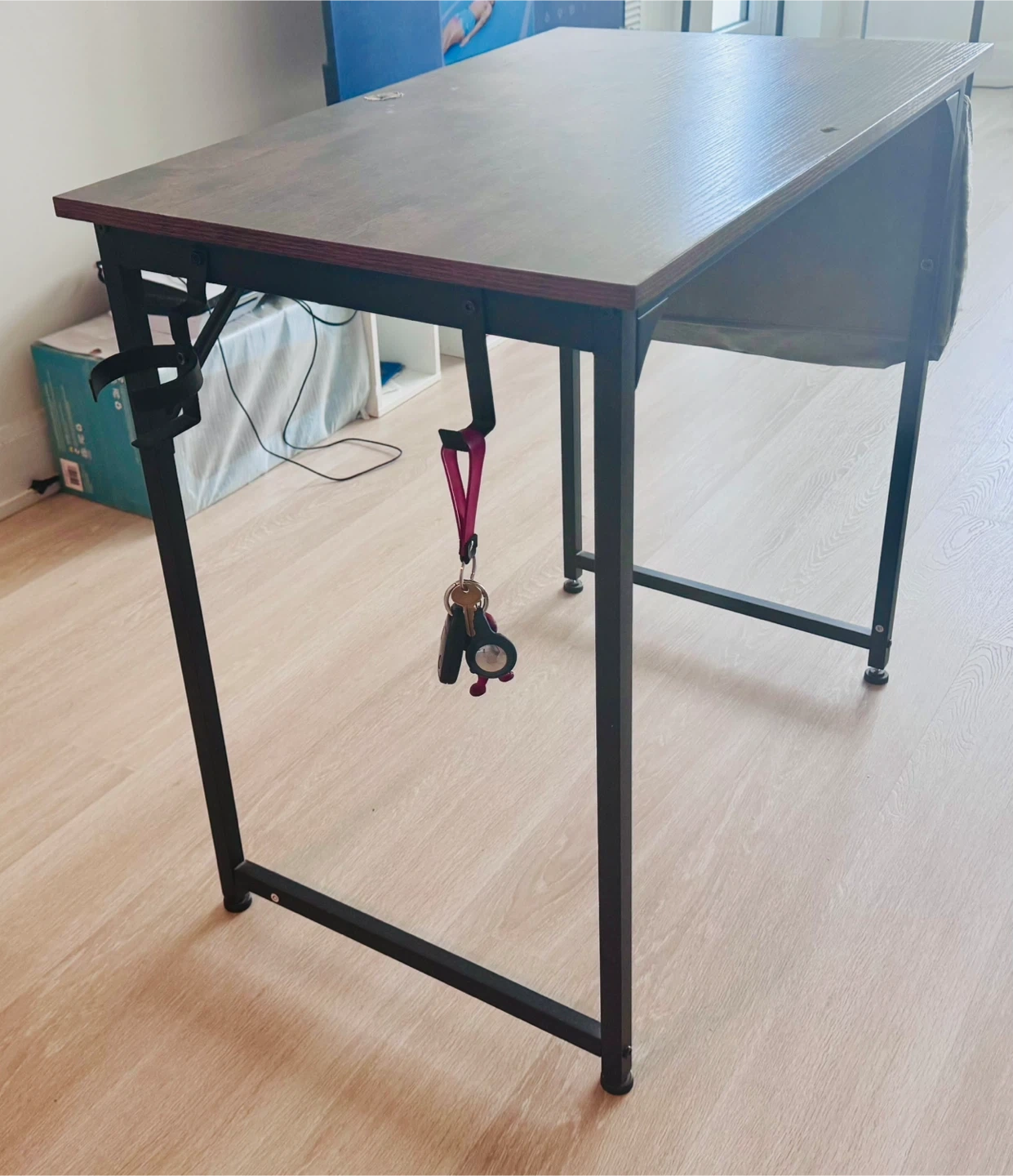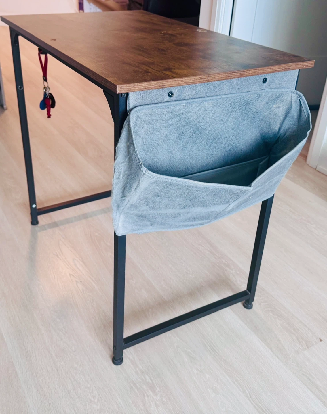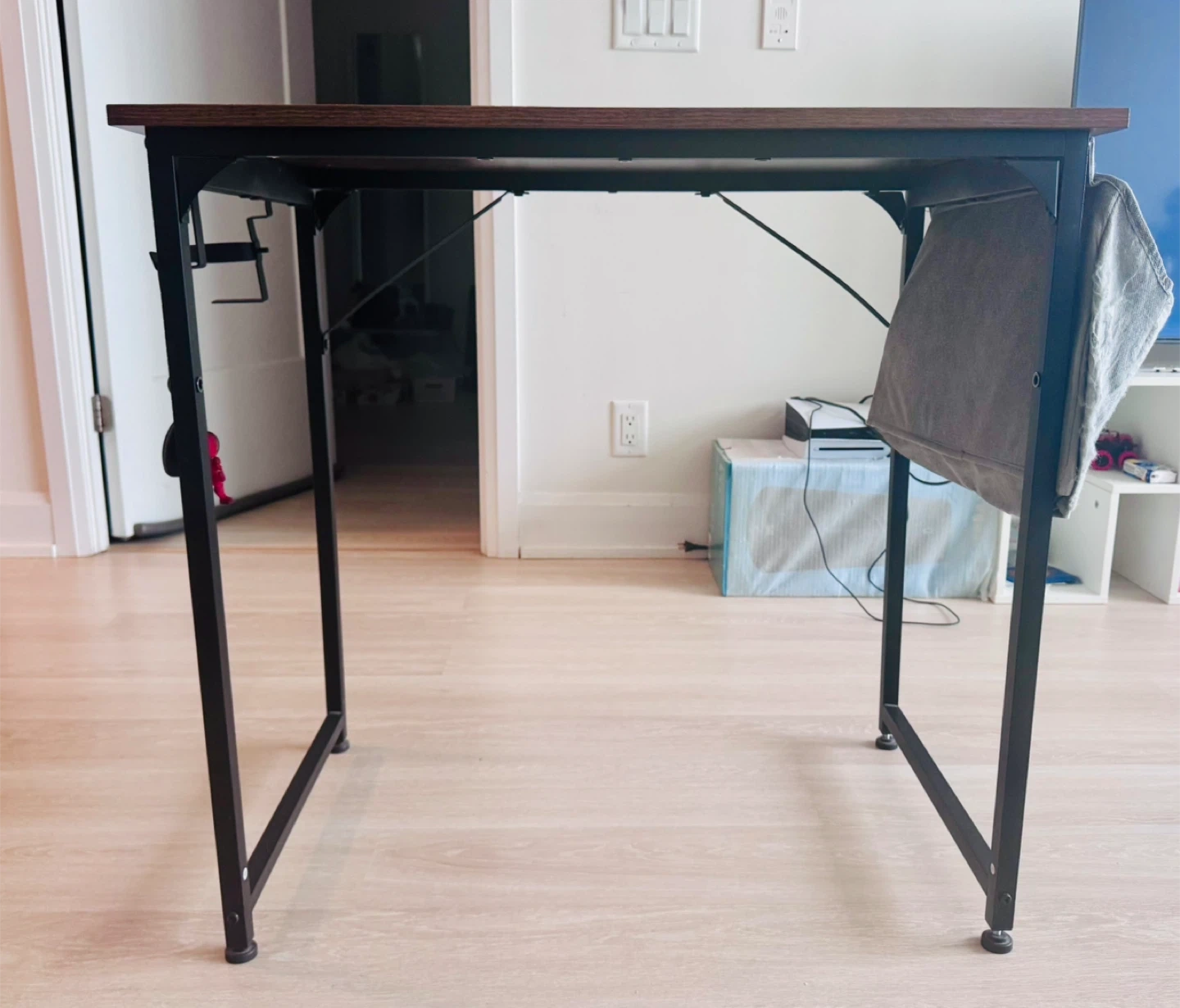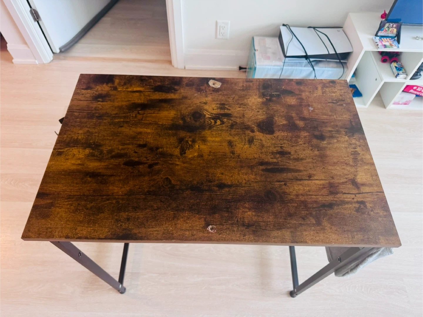 Simple and sturdy desk with a wooden top and strong metal frame.