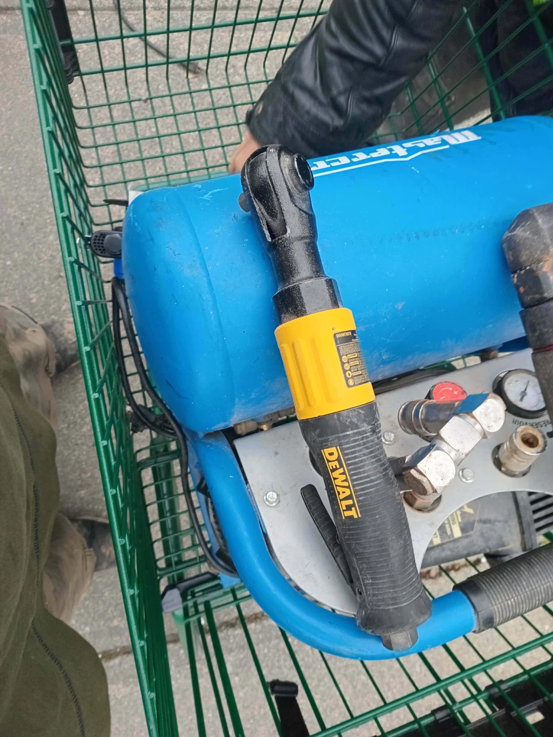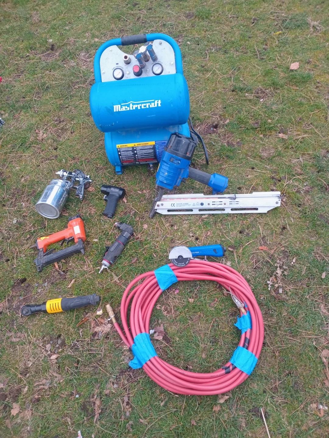 This set includes a Mastercraft air compressor, a nail gun, a spray gun, and an angle grinder. It also comes with an air hose and a smaller stapler. Everything you need for your next project!
