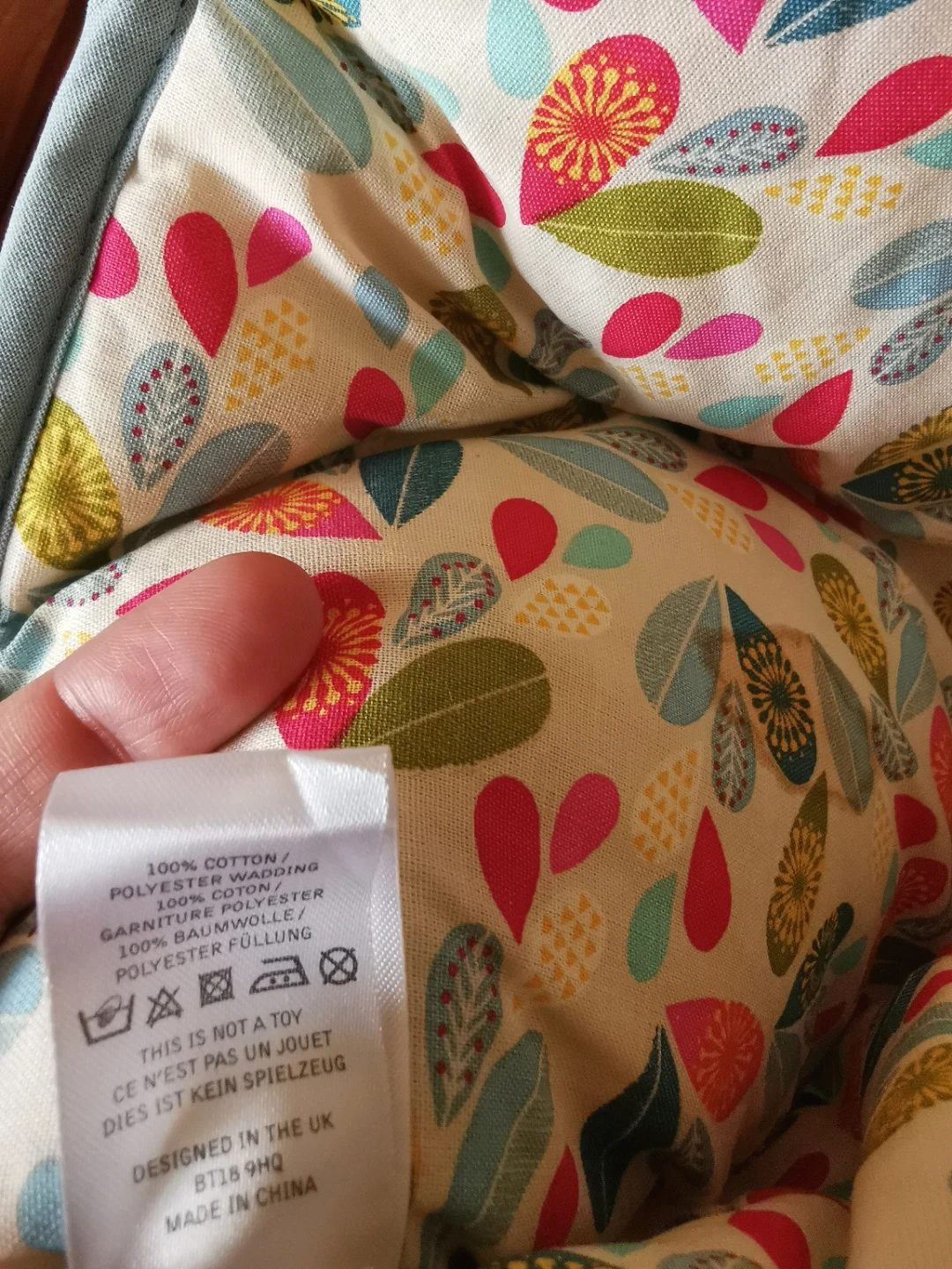 The padded cat tea cozy measures 11 inches high without the fabric hanging loop by 13 inches wide not counting the curled tail by 2 inches thick not counting the padded legs. It was designed in the UK and made in China and is 100% Cotton with Polyester padding.