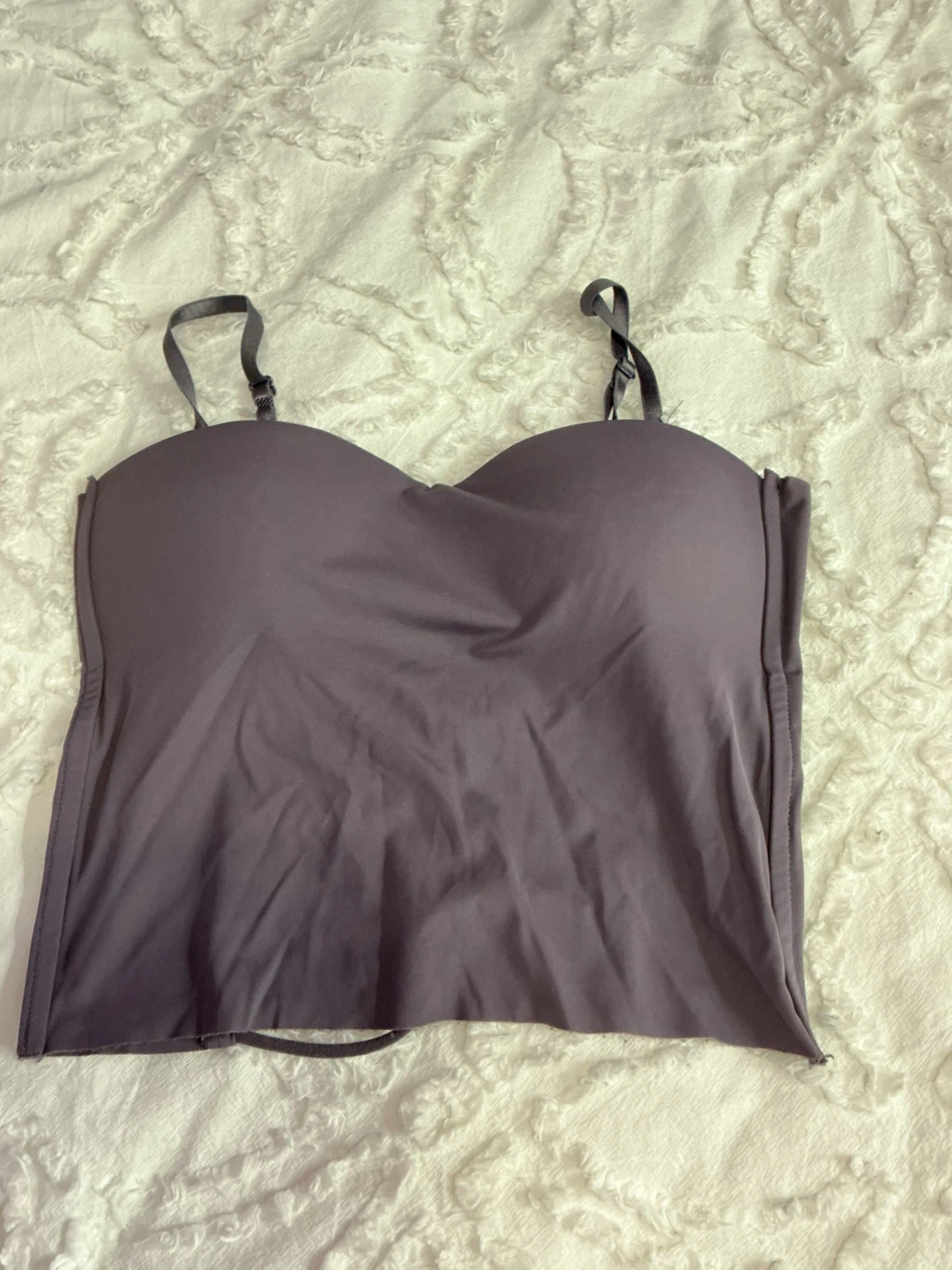 This is a grey bralette top with adjustable straps. It features a strappy detail on the back for a stylish look. The fabric is soft and comfortable. Wore just once.