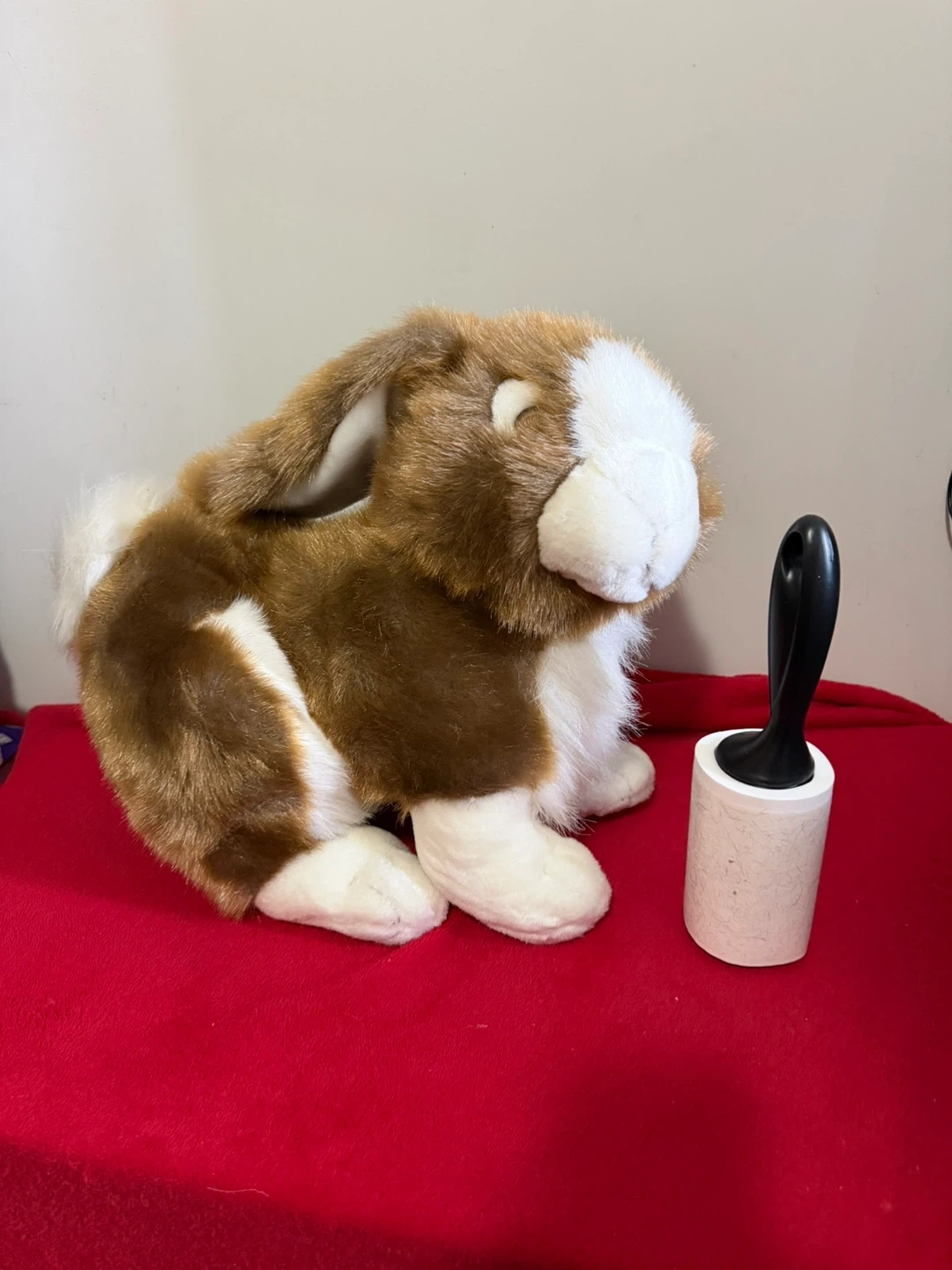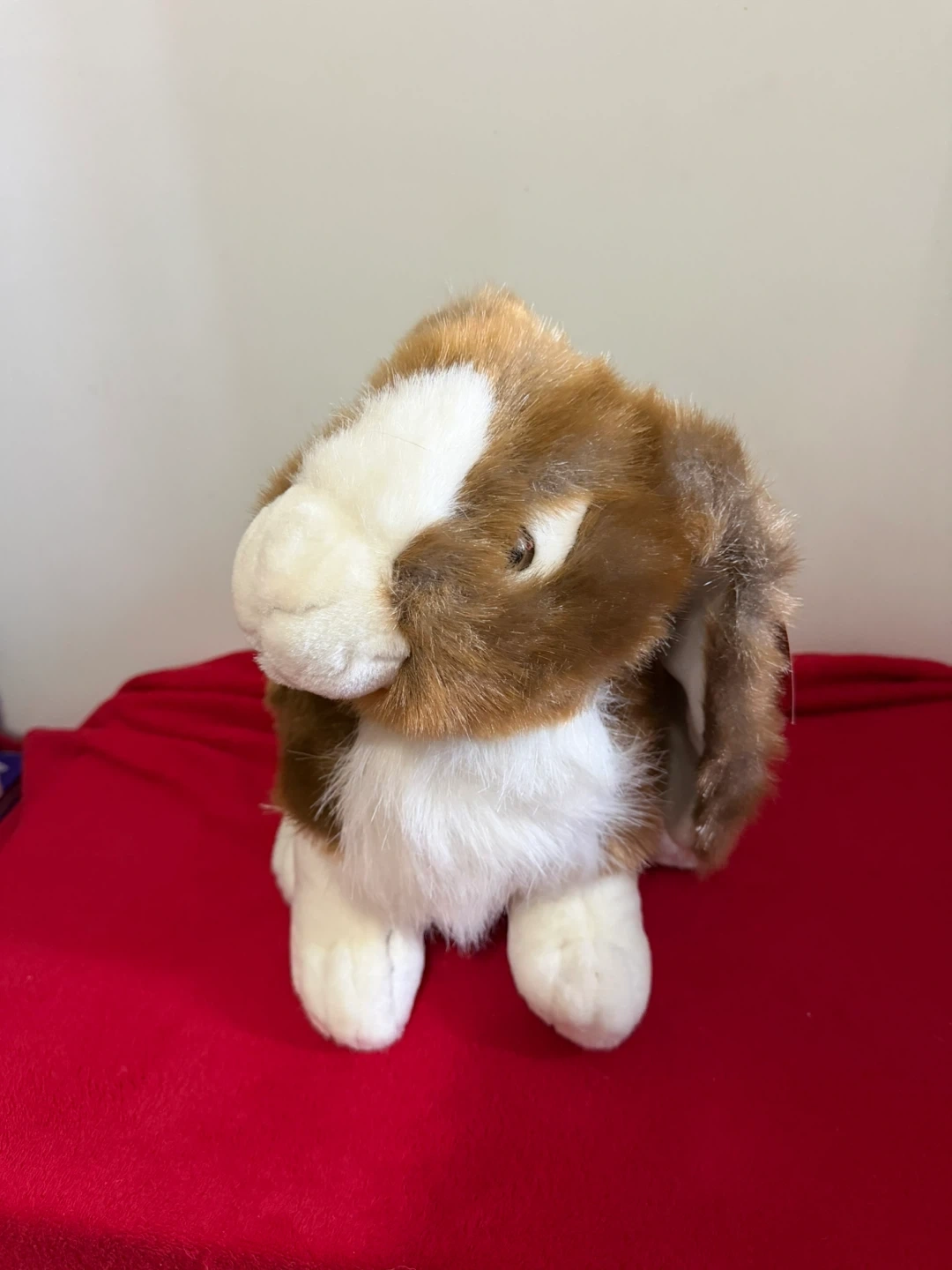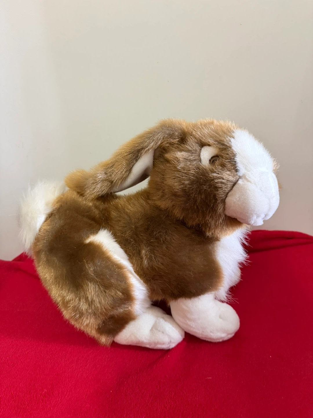 This is a soft, brown and white crouching bunny plush toy. It's made with fluffy material and has floppy ears. This plush toy is great for kids or as a decorative item!