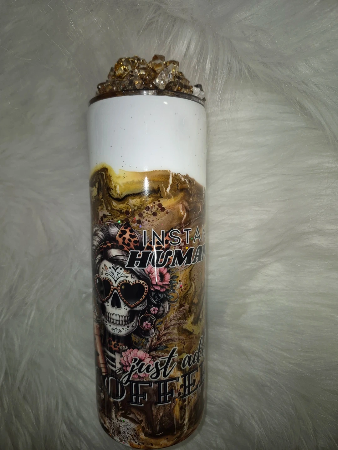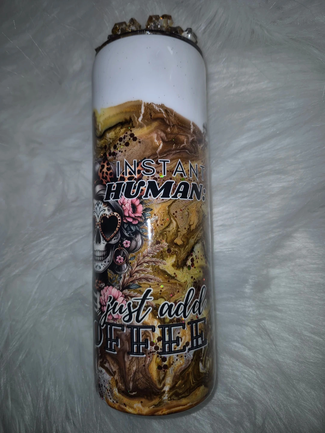 This is a custom 20 oz tumbler with a "Instant Human Just Add Coffee" design. It features a skull graphic and decorative elements. The tumbler is topped with decorative ice. It's perfect for keeping your beverages hot or cold.